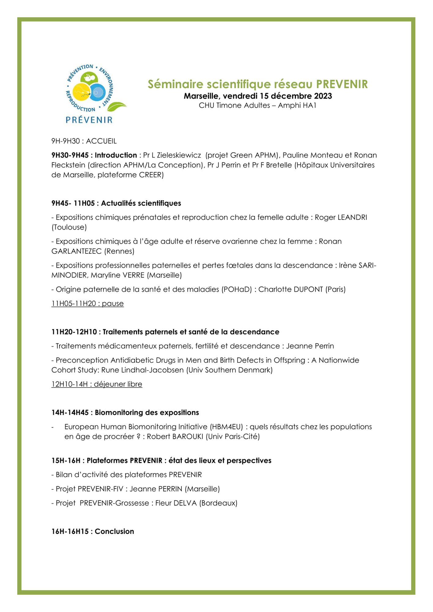 Le séminaire scientifique réseau PREVENIR Marseille, aura lieu le vendredi 15 décembre 2023 au CHU Timone Adultes – Amphi HA1.