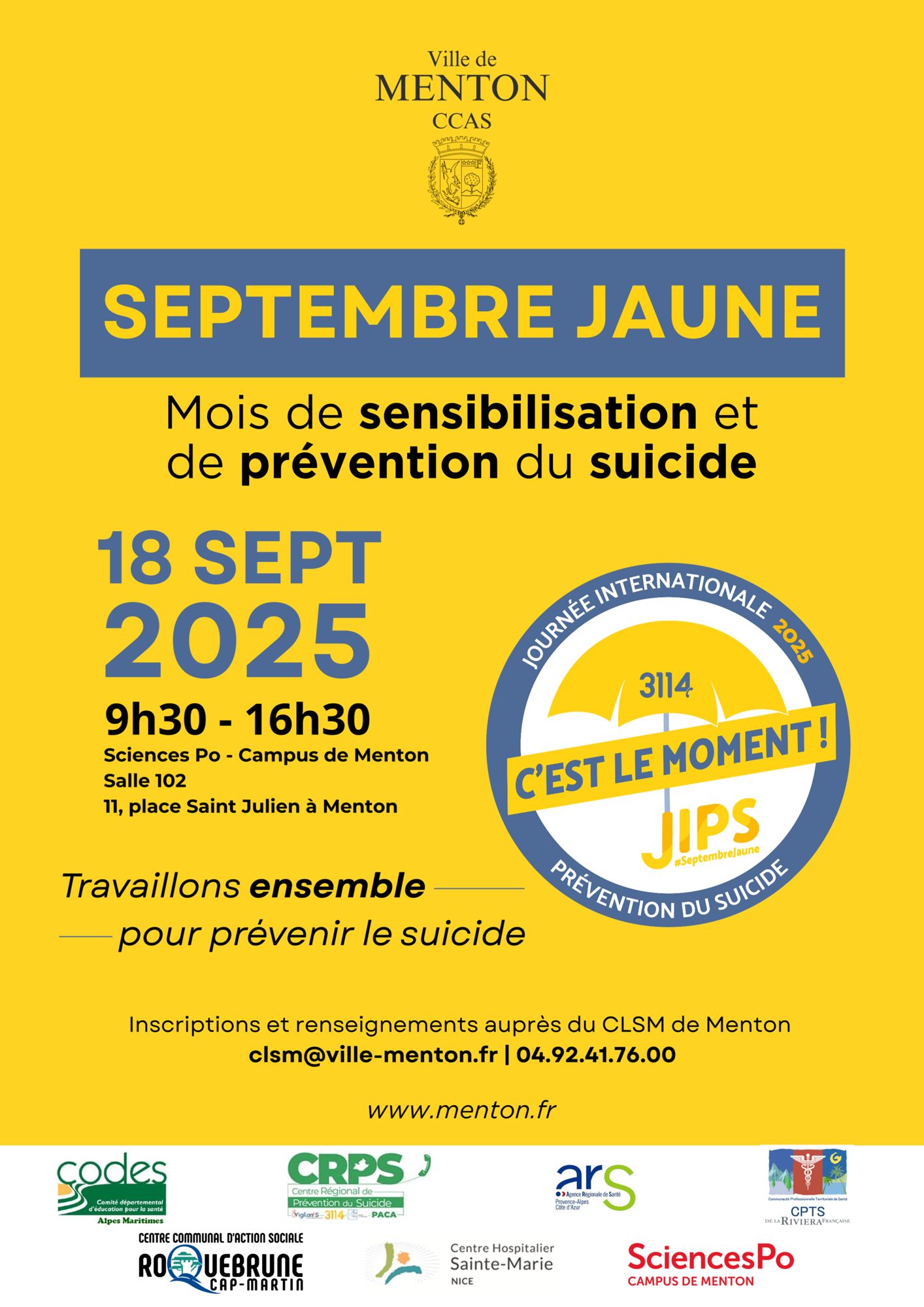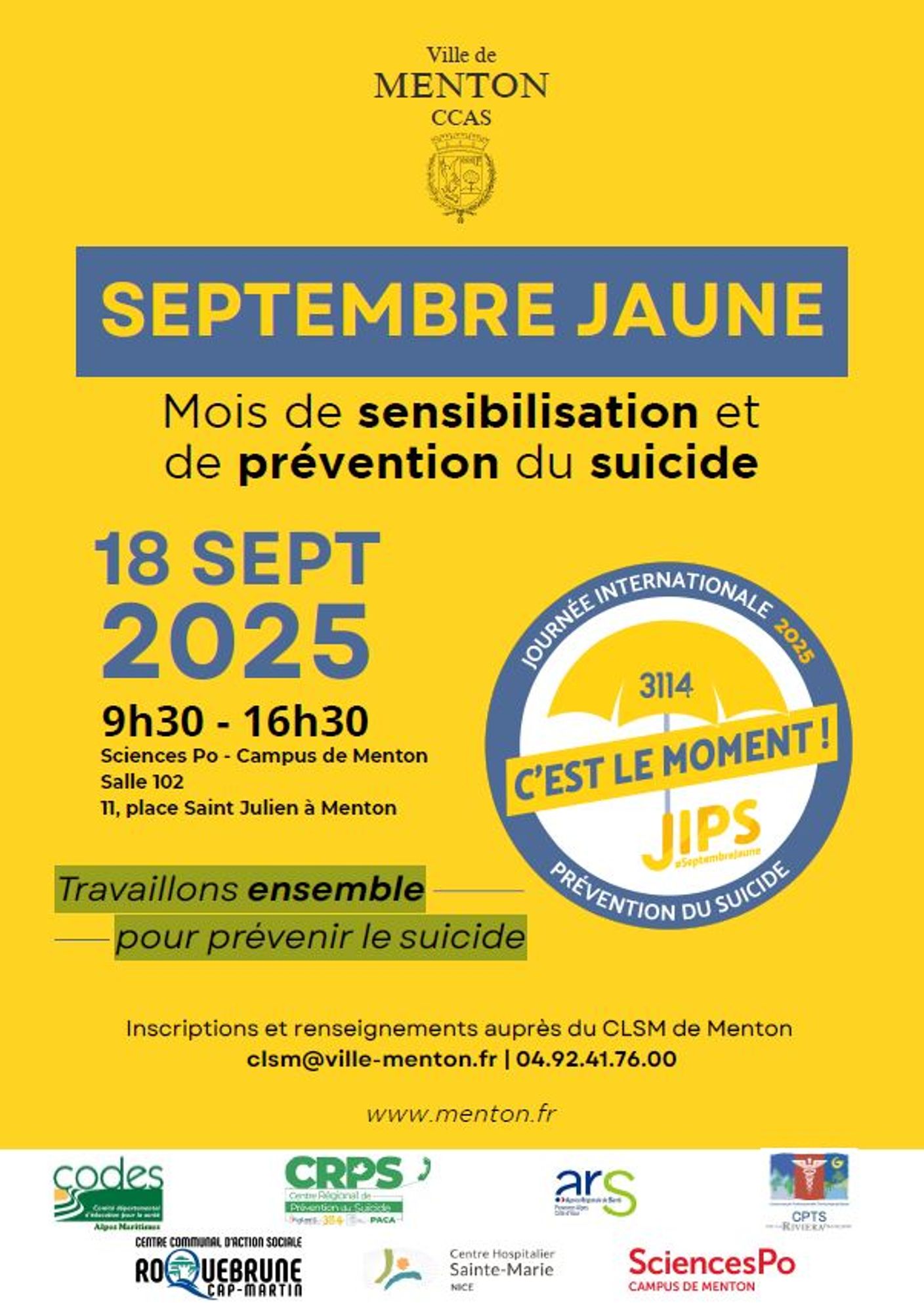 Dans le cadre de la campagne Septembre Jaune, mois de sensibilisation et de prévention du suicide, la Ville de Menton organise une journée dédiée à la prévention et à la sensibilisation autour de cette problématique cruciale. Cet événement vise à informer, échanger et travailler ensemble pour mieux comprendre et prévenir le suicide.