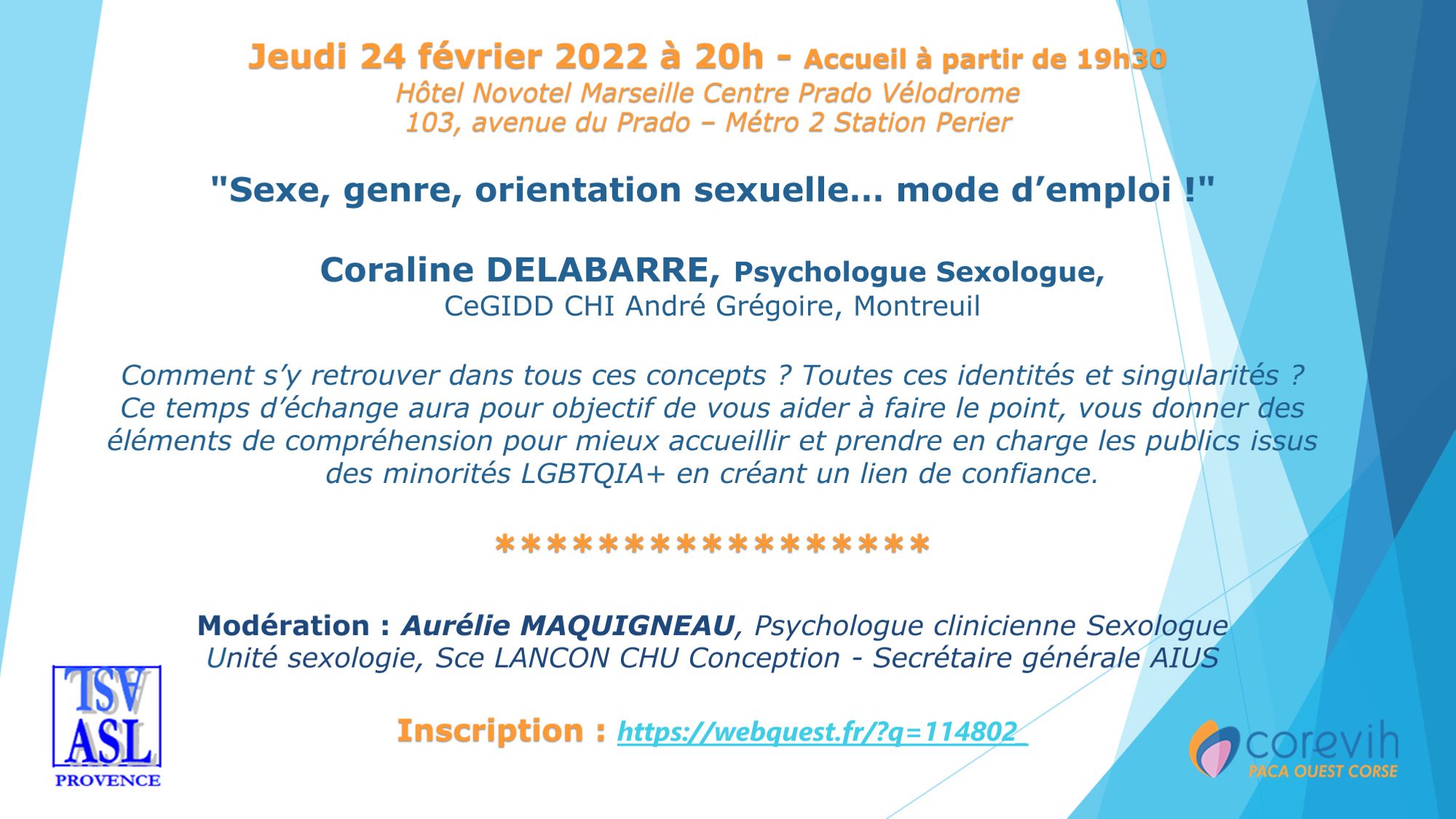 L’Association des Sidénologistes Libéraux de Provence et le COREVIH Paca Ouest Corse ont le plaisir de vous inviter à la réunion d’information qui se tiendra le Jeudi 24 février 2022 à 20h — Accueil buffet à 19h30, Hôtel Novotel Marseille Centre Prado Vélodrome, 103, avenue du Prado – Métro 2 Station Perier sur :
