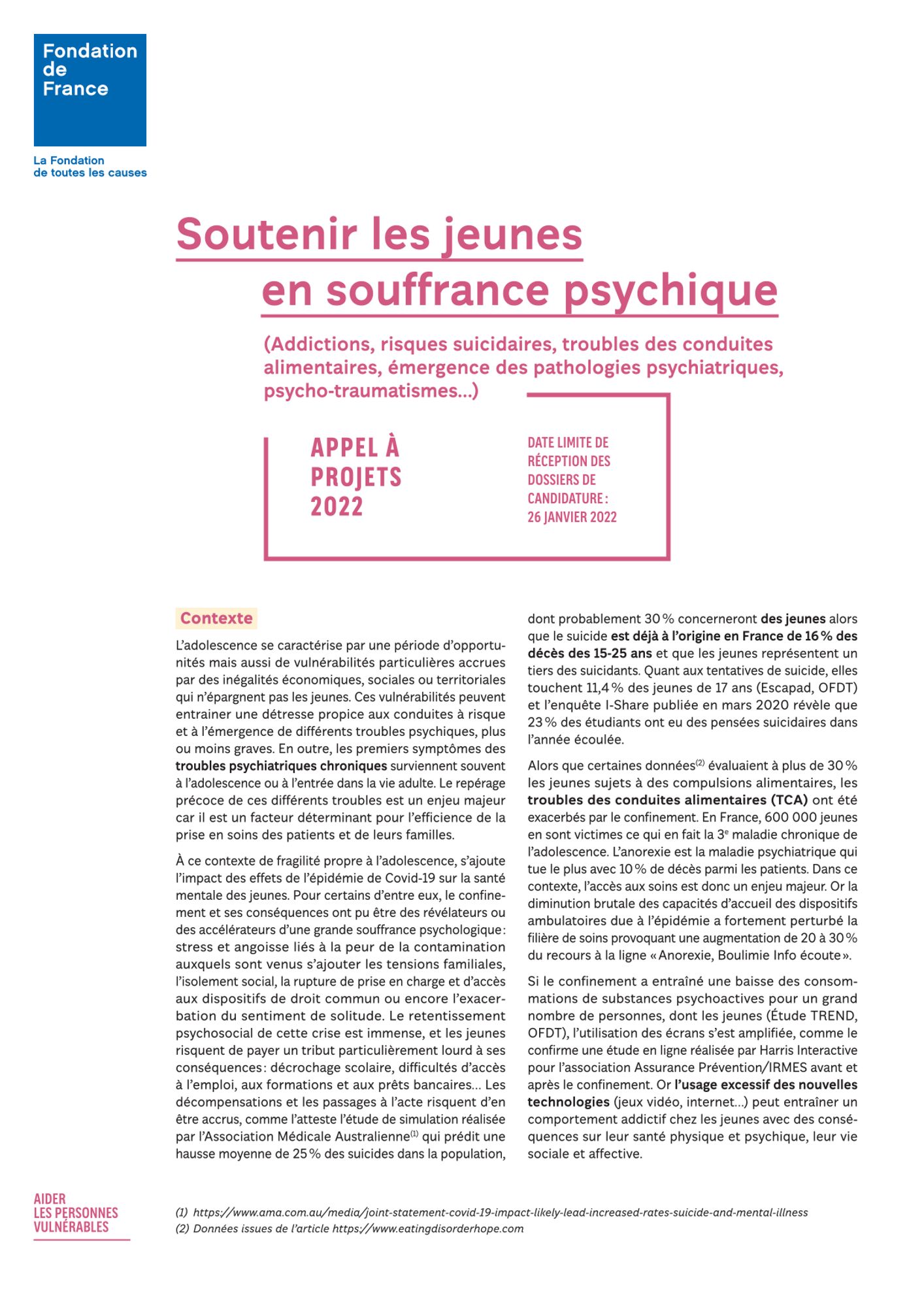 - d’autres problématiques psychopathologiques et d’autres situations de mal-être (dépression, troubles anxieux, comportements violents, psycho-traumatismes…). Les thématiques suivantes sont exclues de l’appel à projets :