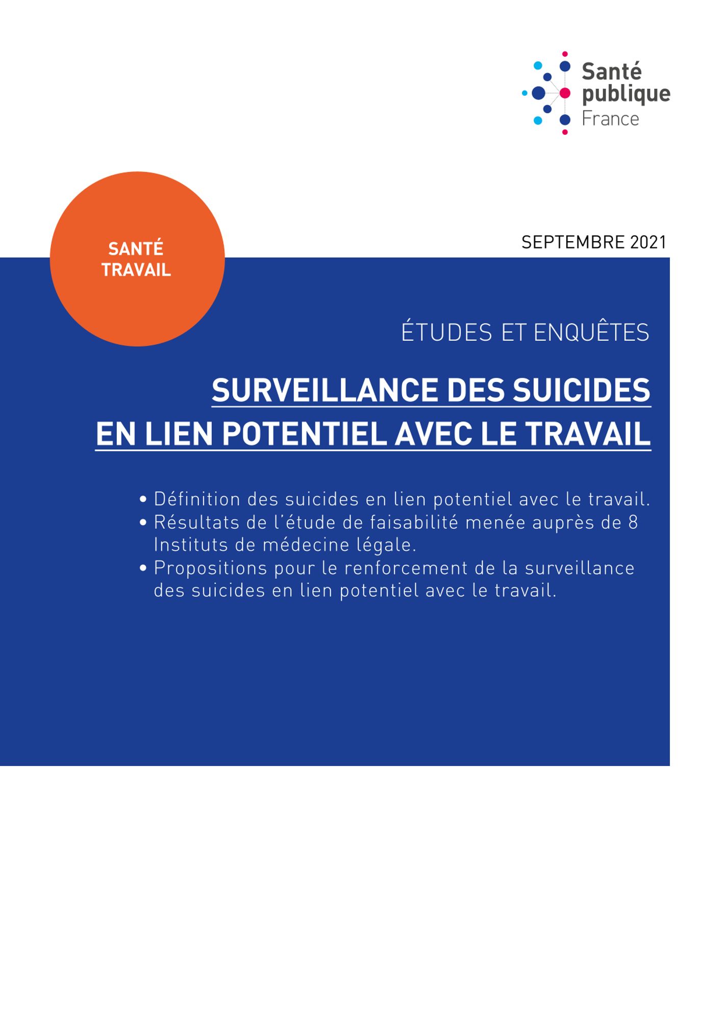 Cette étude montre la possibilité de développer un système de surveillance des suicides en lien potentiel avec le travail à partir des données des IML. L’extension au niveau national et la pérennisation de ce système sont préconisées. Il est proposé d’intégrer ou d’adosser au volet médical complémentaire du certificat de décès, un questionnaire contenant les données jugées pertinentes par cette étude. Ainsi à terme, Santé publique France pourrait assurer une surveillance de ces suicides, qui complèterait ses autres travaux sur les conduites suicidaires par catégories professionnelles et secteurs d’activité (agriculture, administration pénitentiaire, etc.). (Source Santé Publique France)