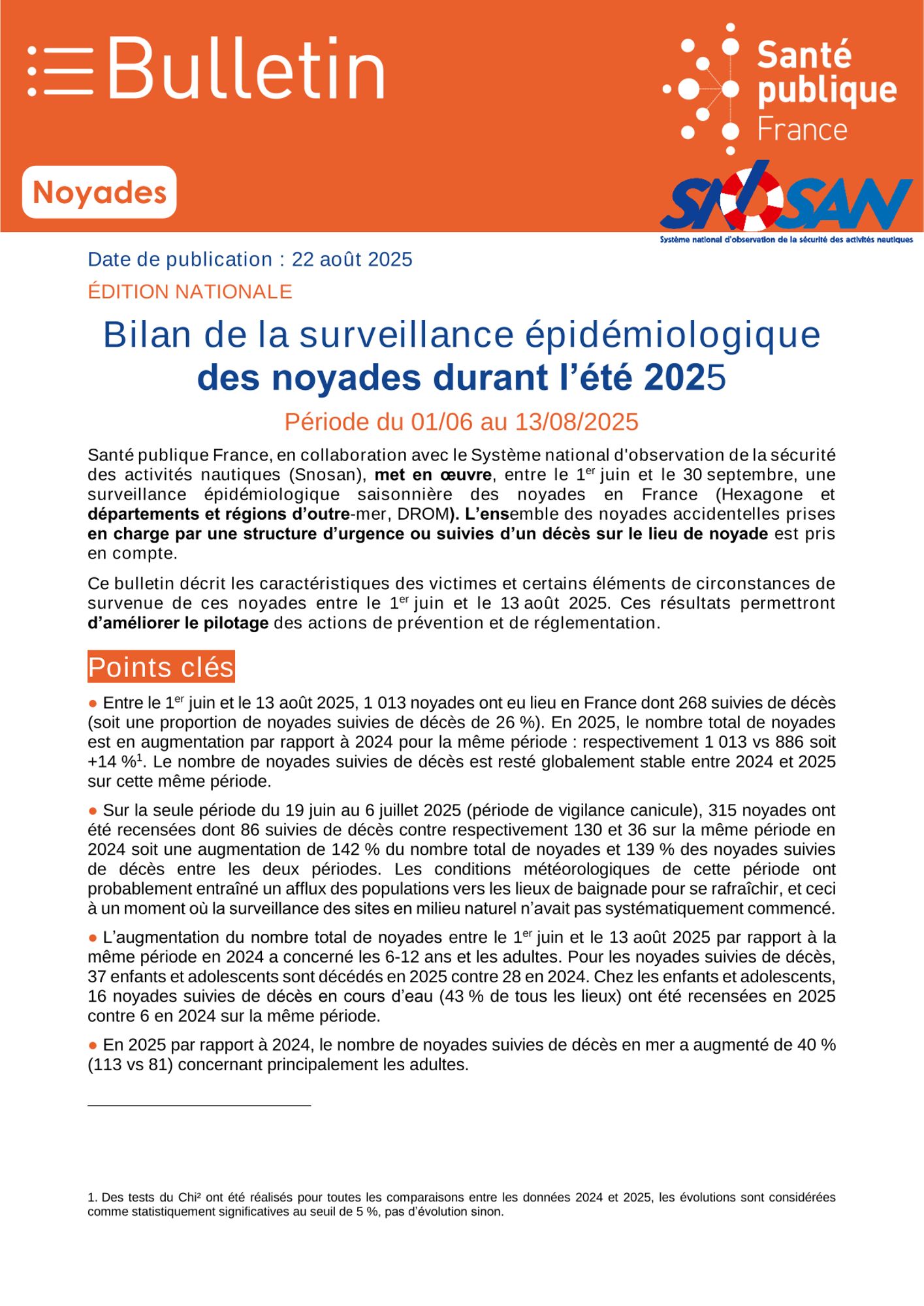 - Entre le 1er juin et le 13 août 2025, 1 013 noyades ont eu lieu en France dont 268 suivies de décès (soit une proportion de noyades suivies de décès de 26 %). En 2025, le nombre total de noyades est en augmentation par rapport à 2024 pour la même période : respectivement 1 013 vs 886 soit +14 %. Le nombre de noyades suivies de décès est resté globalement stable entre 2024 et 2025 sur cette même période.