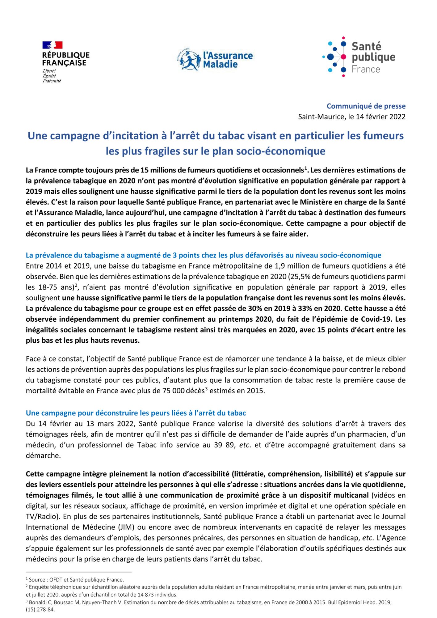 La France compte toujours près de 15 millions de fumeurs quotidiens et occasionnels1. Les dernières estimations de la prévalence tabagique en 2020 n’ont pas montré d’évolution significative en population générale par rapport à 2019 mais elles soulignent une hausse significative parmi le tiers de la population dont les revenus sont les moins élevés. C’est la raison pour laquelle Santé publique France, en partenariat avec le Ministère en charge de la Santé et l’Assurance Maladie, lance aujourd’hui, une campagne d’incitation à l’arrêt du tabac à destination des fumeurs et en particulier des publics les plus fragiles sur le plan socio-économique. Cette campagne a pour objectif de déconstruire les peurs liées à l’arrêt du tabac et à inciter les fumeurs à se faire aider.