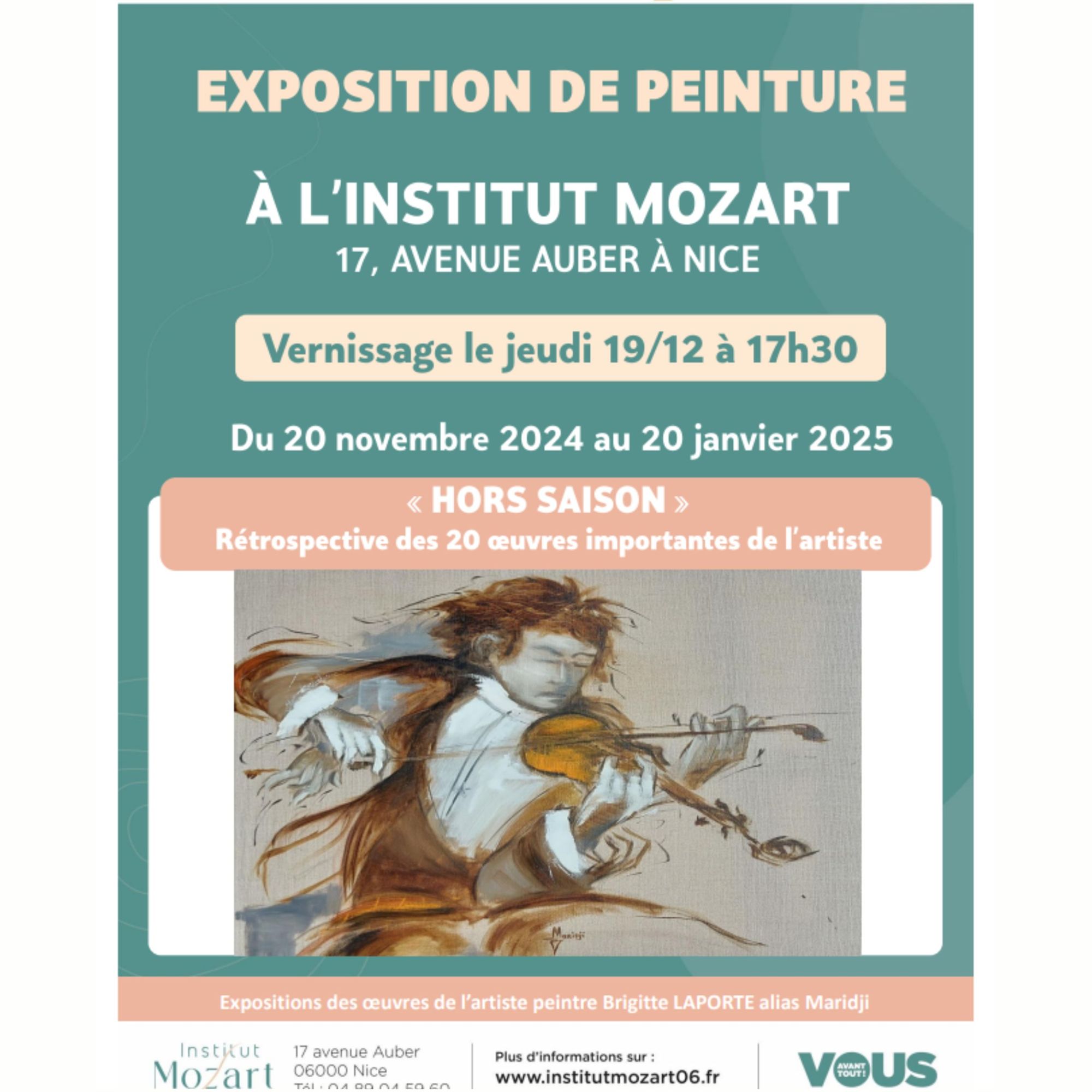 L’Institut Mozart est ravi d’accueillir la nouvelle exposition de l’artiste peintre Brigitte Laporte, alias Maridji, intitulée "Hors Saison", une belle opportunité d’allier art et bien-être, du 25 novembre 2024 au 31 janvier 2025.