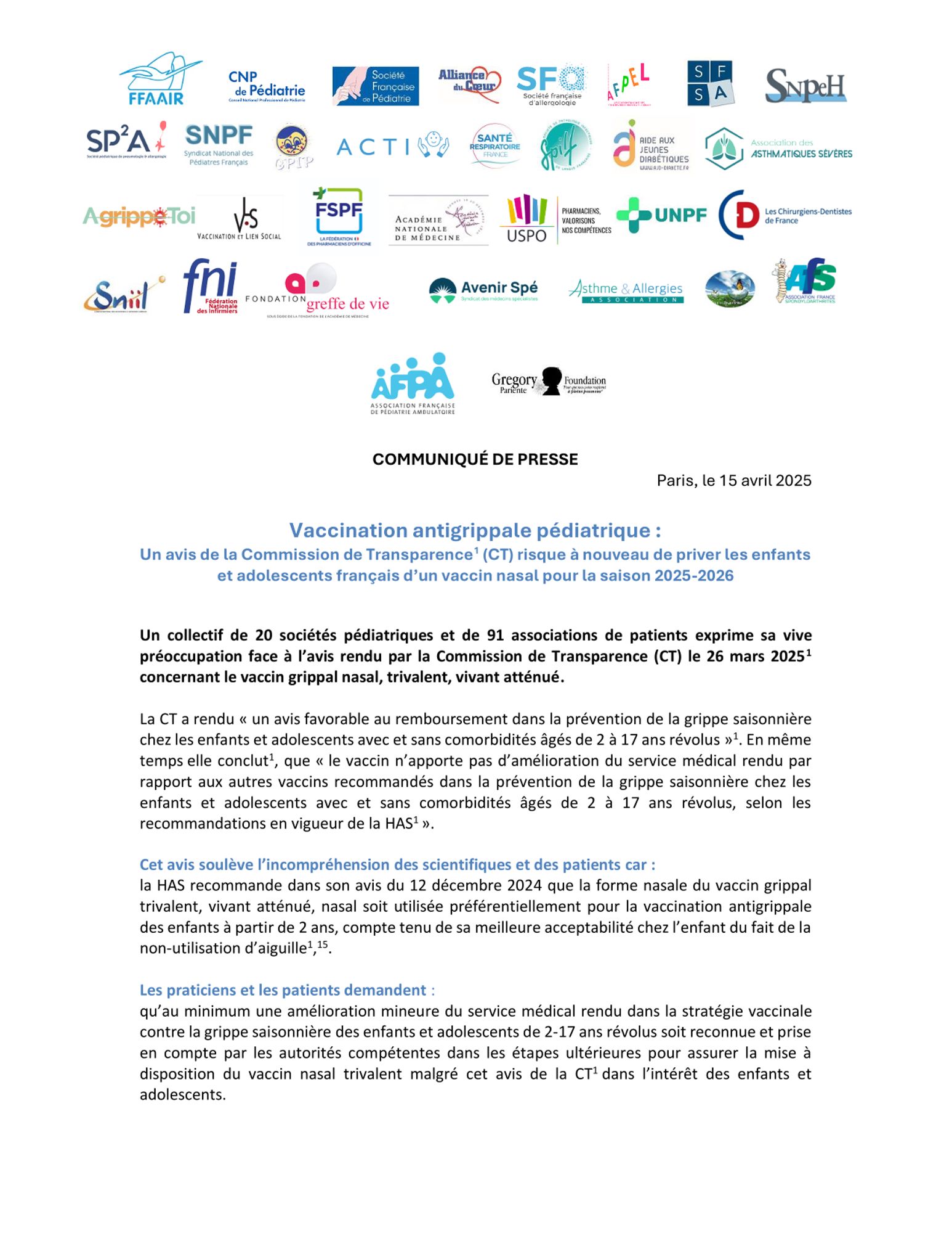 Un collectif de 20 sociétés pédiatriques et de 91 associations de patients exprime sa vive préoccupation face à l’avis rendu par la CT le 26 mars 2025 concernant le vaccin grippal nasal, trivalent, vivant atténué (Fluenz ®).