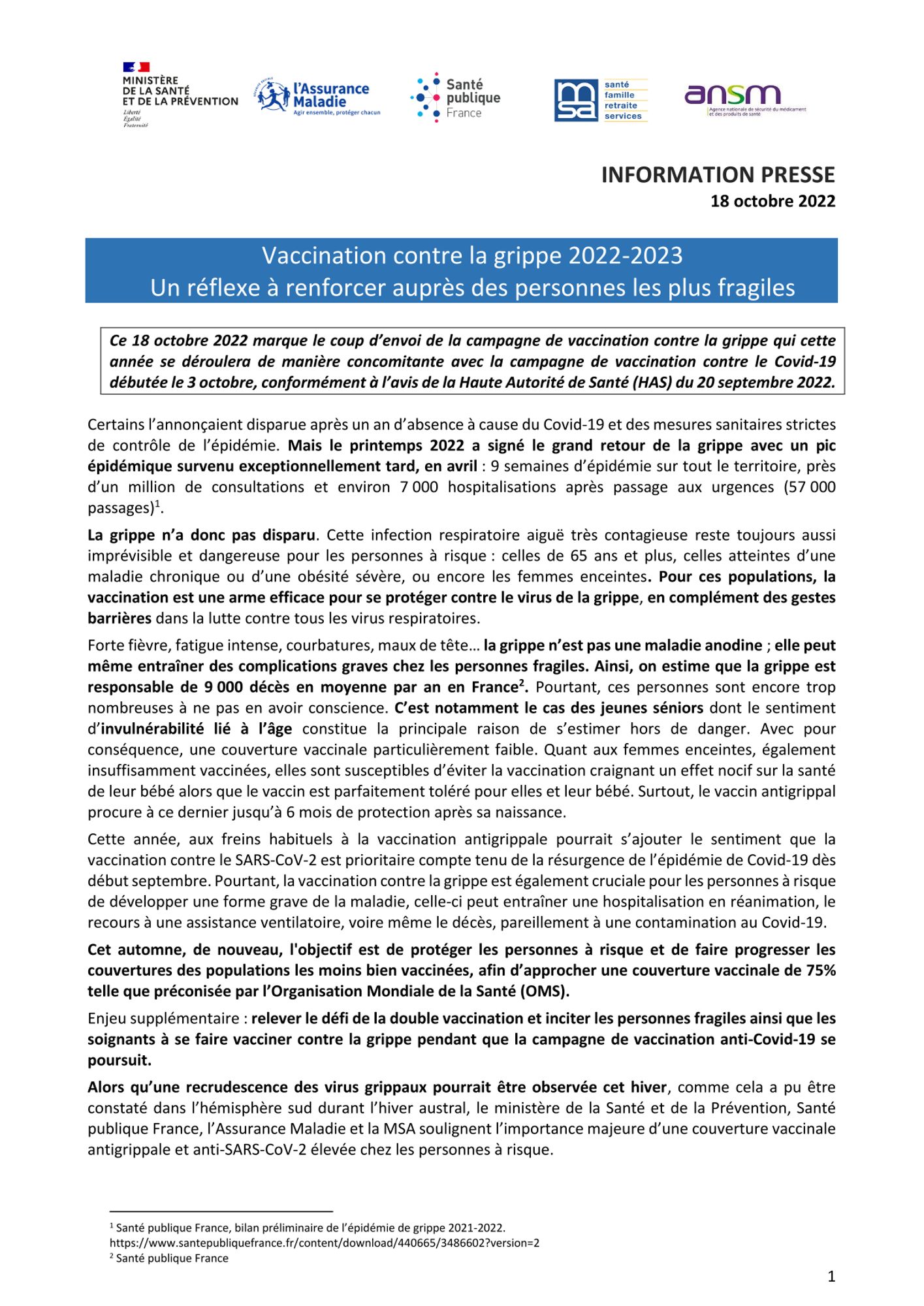 Ce 18 octobre 2022 marque le coup d’envoi de la campagne de vaccination contre la grippe qui cette année se déroulera de manière concomitante avec la campagne de vaccination contre le Covid-19 débutée le 3 octobre, conformément à l’avis de la Haute Autorité de Santé (HAS) du 20 septembre 2022.