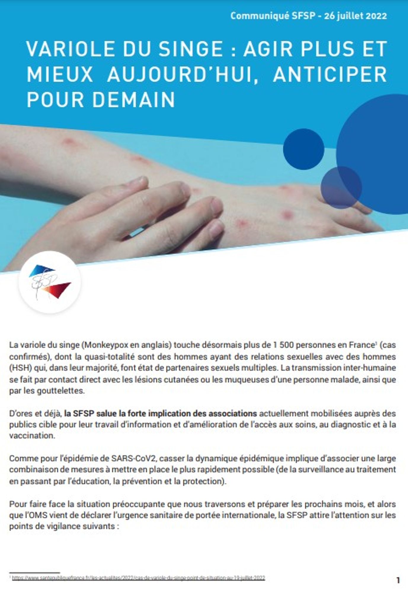 En lien avec les données et les réflexions produites à l'échelle internationale, la SFSP appelle à la mise en place d'une réflexion prospective sur la flambée actuelle et son évolution. Elle appelle en particulier à développer des modèles de diffusion du virus qui permettent d'élaborer des scénarios concernant les groupes de population potentiellement concernés et les outils de réponse à mobiliser. L'hypothèse d'une diffusion du virus au-delà des groupes actuellement touchés dès la fin de l'été est en effet plausible.