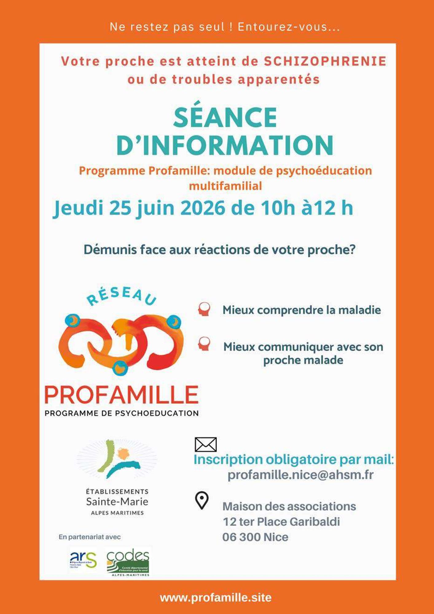 Le Bureau des Aidants des Établissements Sainte-Marie Alpes-Maritimes a organisé une réunion d’information sur le programme Profamille qui s’est tenue le 25 juin 2026 de 10h à 12h dans notre centre hospitalier.