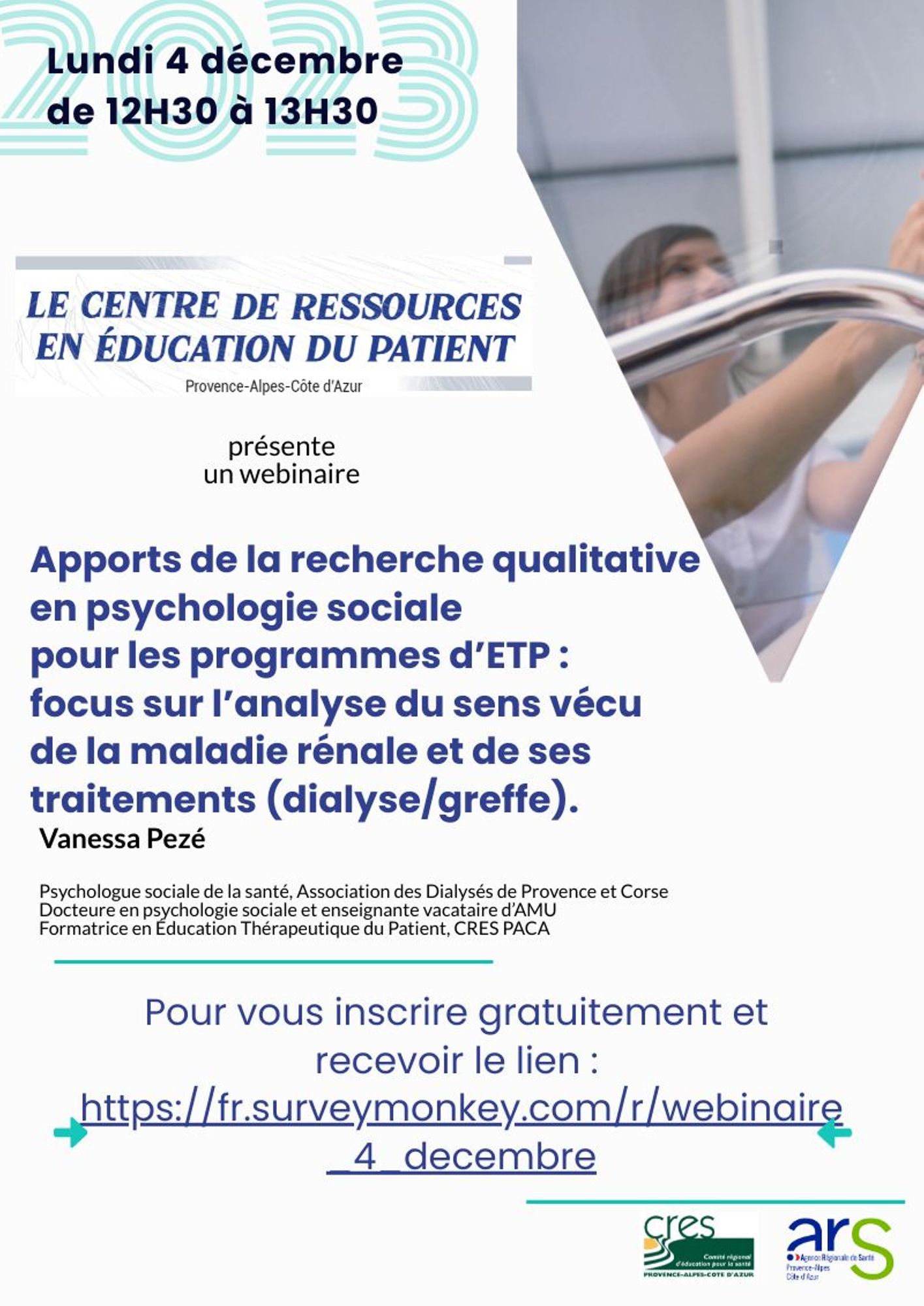 Webinaire ETP le lundi 4 décembre de 12H30 à 13H30 sur "Apports de la recherche qualitative en psychologie sociale pour les programmes d’ETP : focus sur l’analyse du sens vécu de la maladie rénale et de ses traitements (dialyse/greffe)."