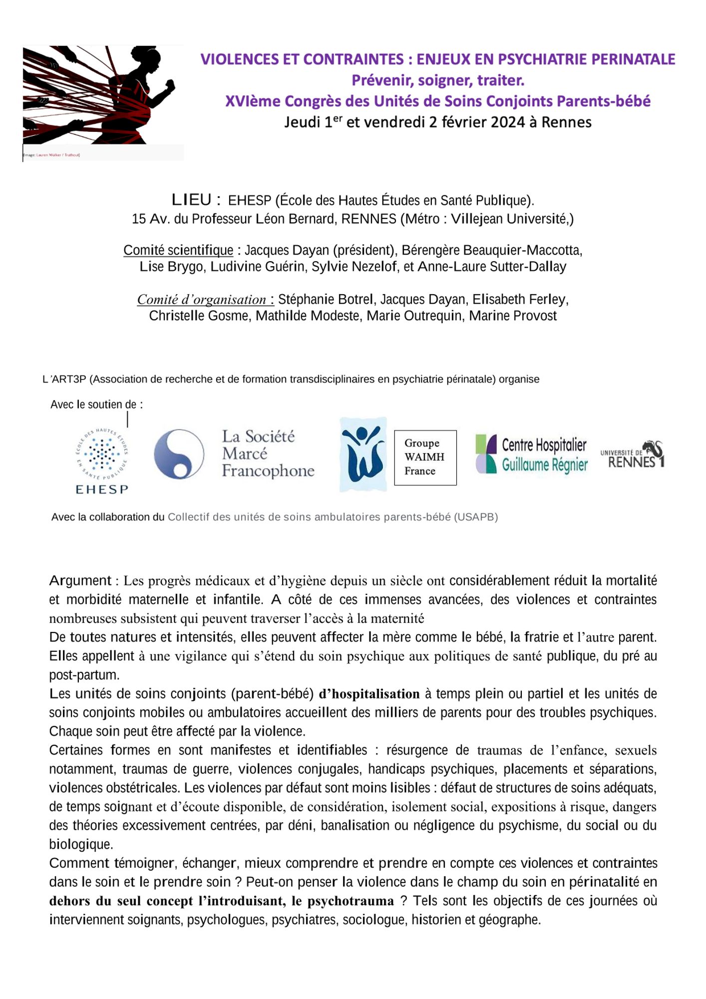 XVIème congrès des unités de soins Conjoints Parents-bébé, les 1er et 02 février 2024 à l'EHESP Rennes.