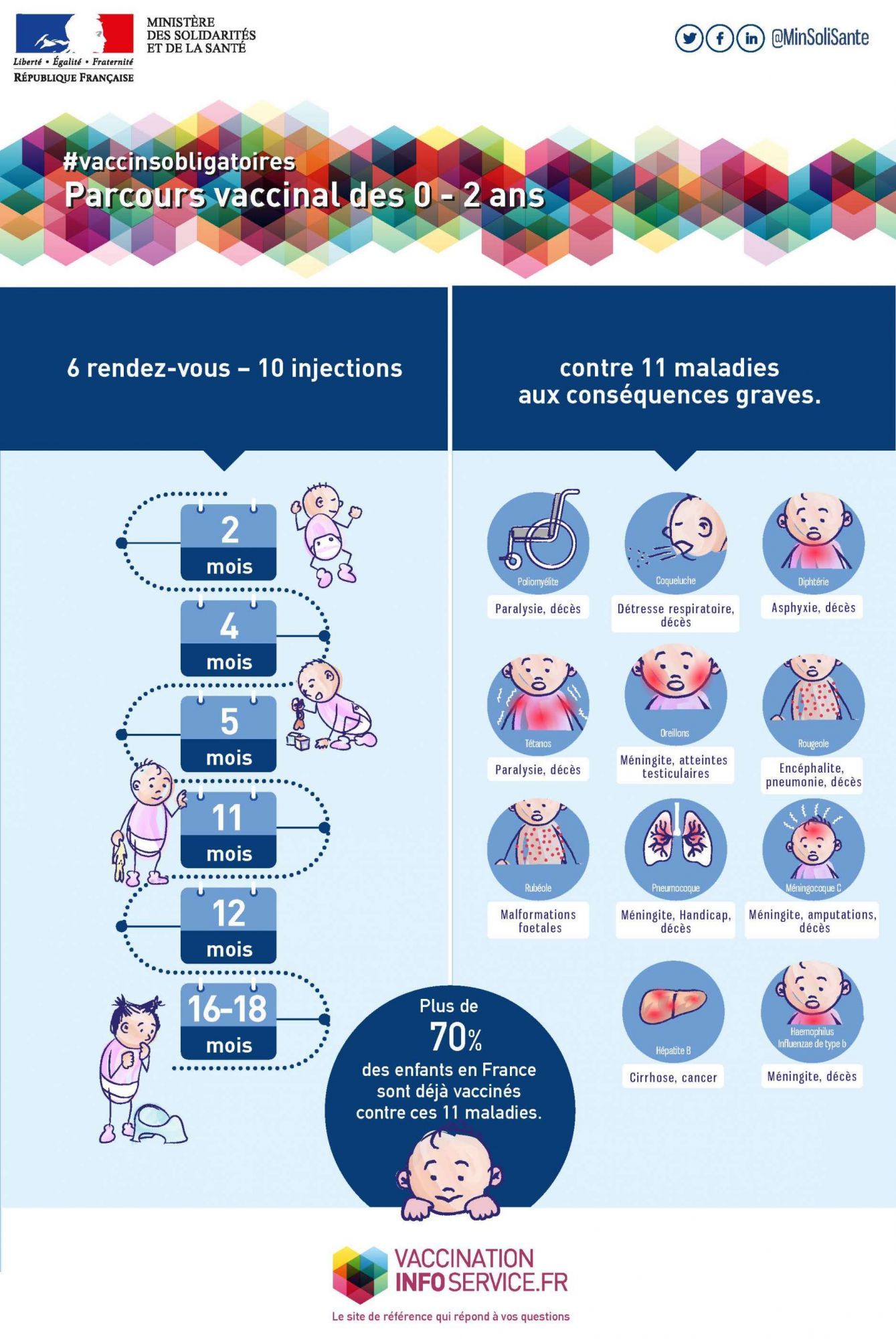 Depuis le 1er janvier 2018, 11 vaccinations sont désormais obligatoires chez l’enfant (contre 3 auparavant). Il s’agit des vaccinations contre la diphtérie, le tétanos, la poliomyélite, la coqueluche, l’Haemophilus influenzae de type b, l’hépatite B, le pneumocoque, le méningocoque C, la rougeole, les oreillons et la rubéole.
