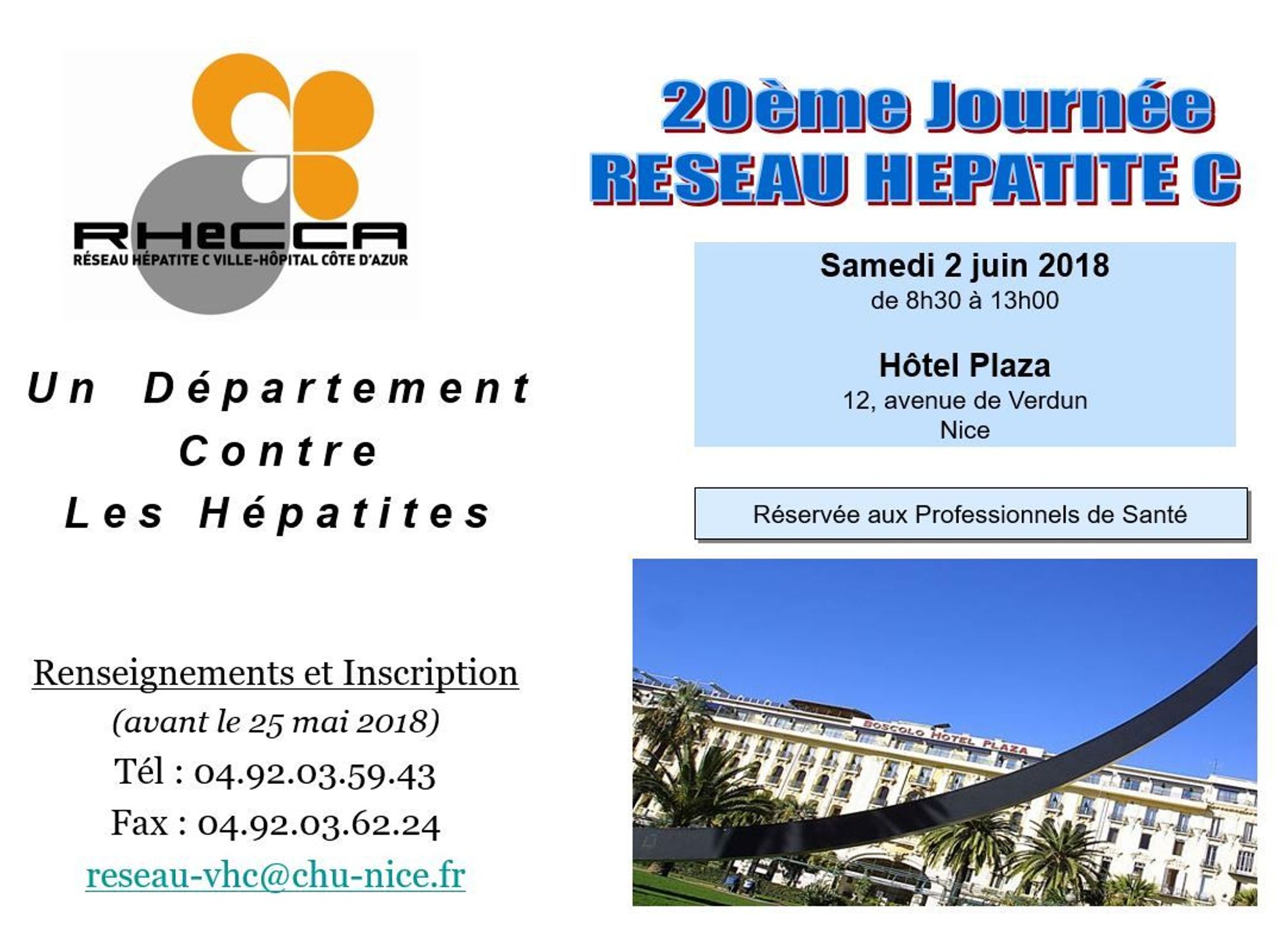 Le Réseau Ville Hôpital Côte d'Azur a le plaisir de vous inviter le samedi 2 juin 2018 à la journée départementale de réactualisation des connaissances organisée avec le soutien des laboratoires Abbvie, BMS, Gilead, et MSD.