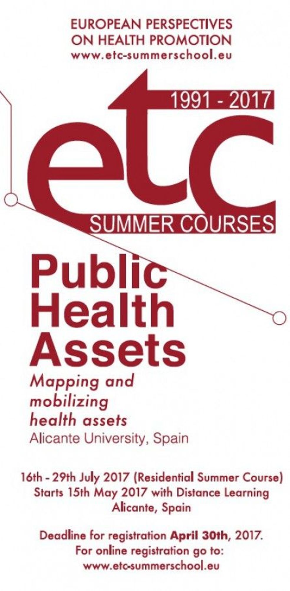 L'Université d’Alicante (Espagne) accueillera l’édition 2017 de l’Université européenne d’été du "European Training Consortium in Public Health and Health Promotion". Ce consortium, dont l’EHESP est membre, organise chaque année un cours de niveau master de 8ECTS comprenant des sessions d’e-learning dispensées à partir du mois de mai et une session d’été d’une durée de 2 semaines. Le Consortium est composé de 11 institutions provenant de 8 pays. La Chaire Inpes « Promotion de la santé » à l’EHESP participe à l’organisation et aux enseignements et souhaite encourager la présence de professionnels et étudiants de la France.