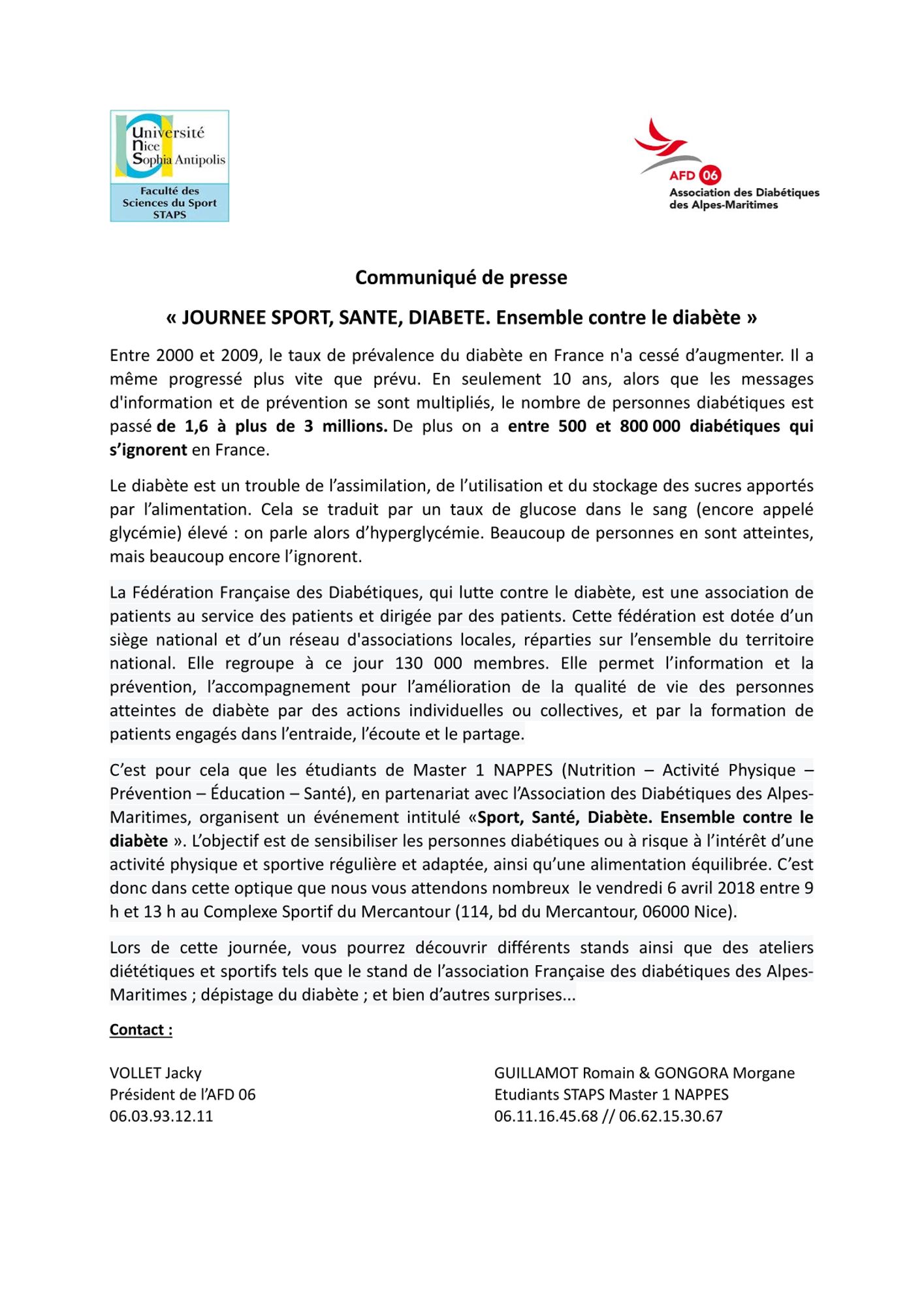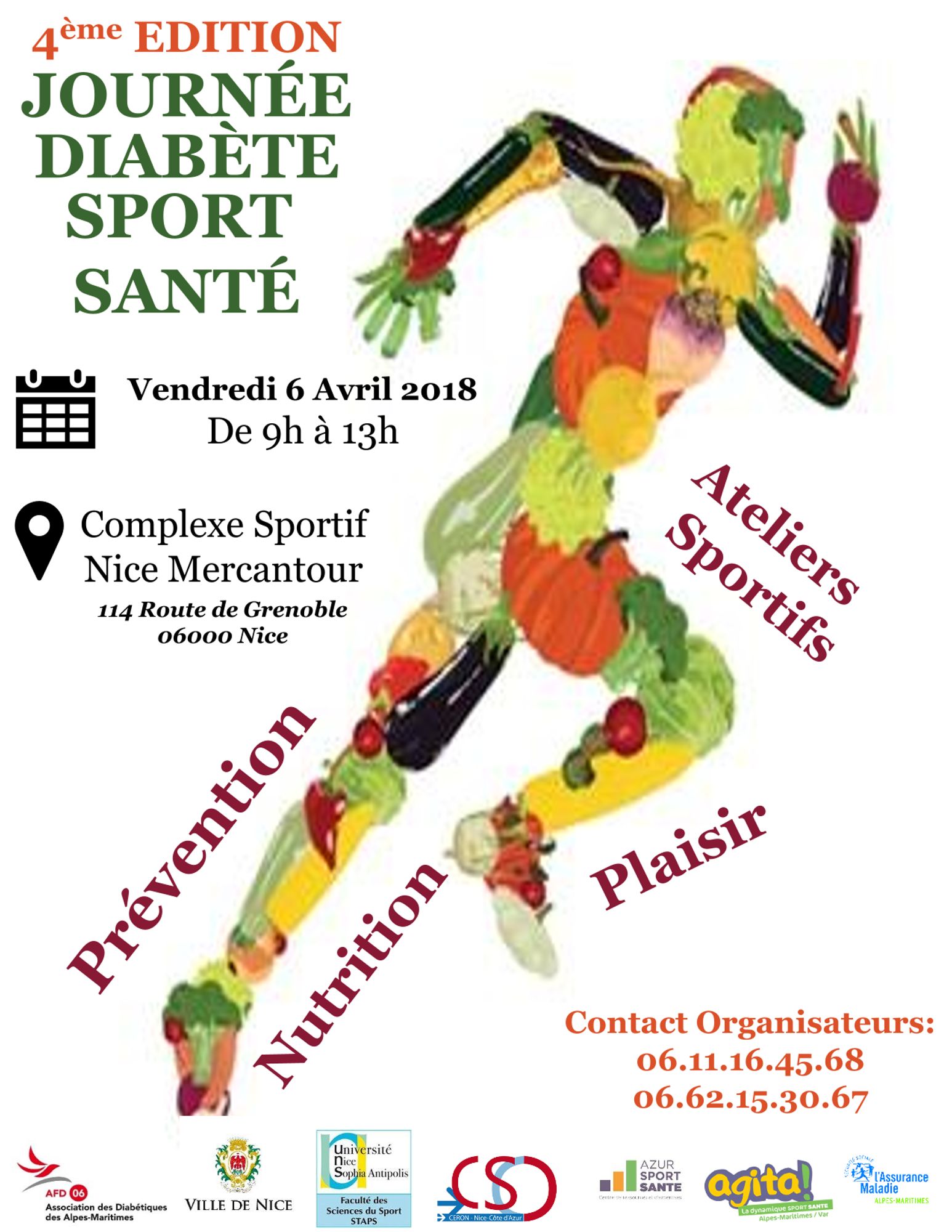 les étudiants de Master 1 NAPPES (Nutrition – Activité Physique – Prévention – Éducation – Santé), en partenariat avec l’Association des Diabétiques des Alpes- Maritimes, organisent un événement intitulé «Sport, Santé, Diabète. Ensemble contre le diabète ». L’objectif est de sensibiliser les personnes diabétiques ou à risque à l’intérêt d’une activité physique et sportive régulière et adaptée, ainsi qu’une alimentation équilibrée.