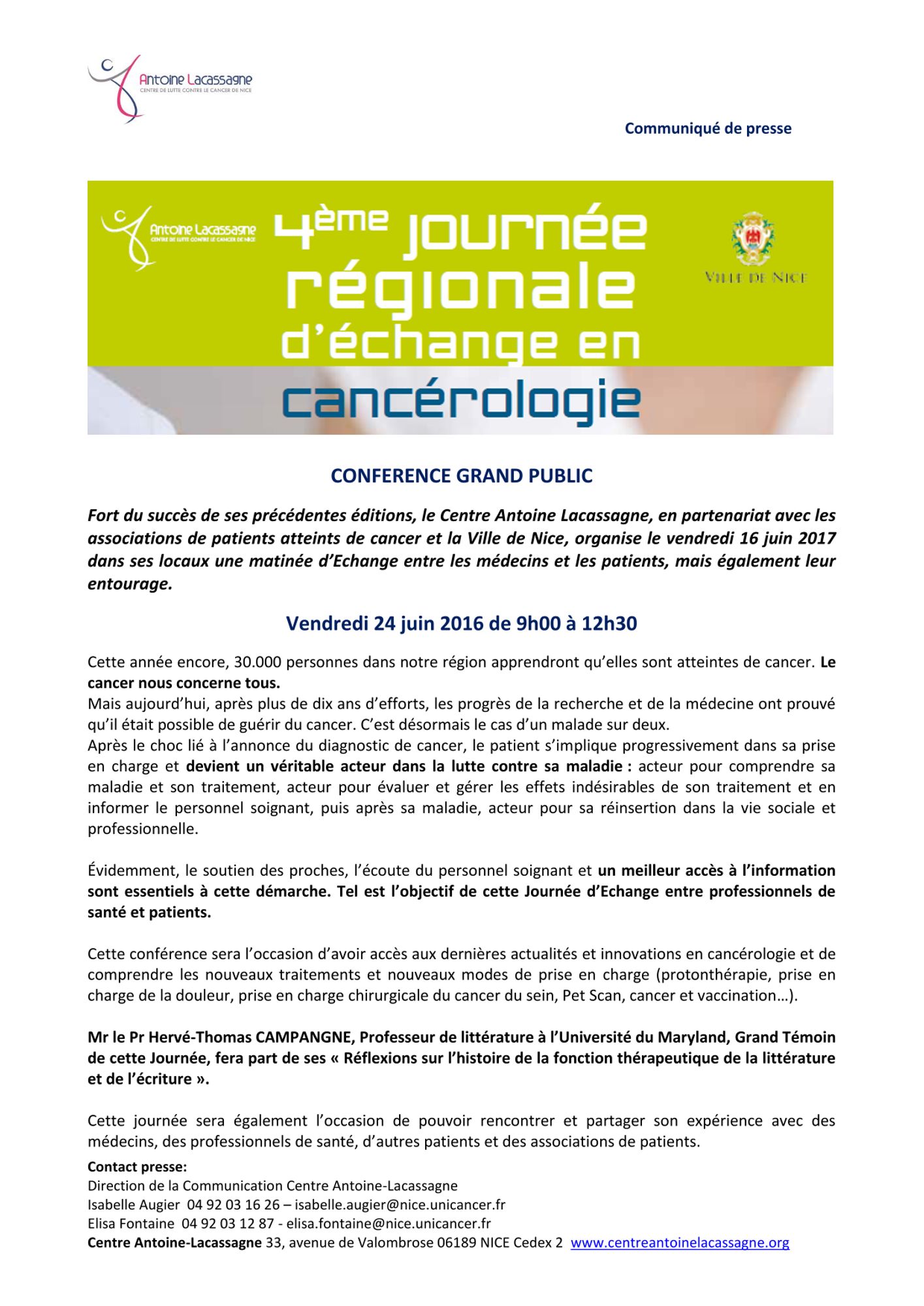 Fort du succès de ses précédentes éditions, le Centre Antoine Lacassagne, en partenariat avec les associations de patients atteints de cancer et la Ville de Nice, organise le vendredi 16 juin 2017 dans ses locaux une matinée d’Echange entre les médecins et les patients, mais également leur entourage.