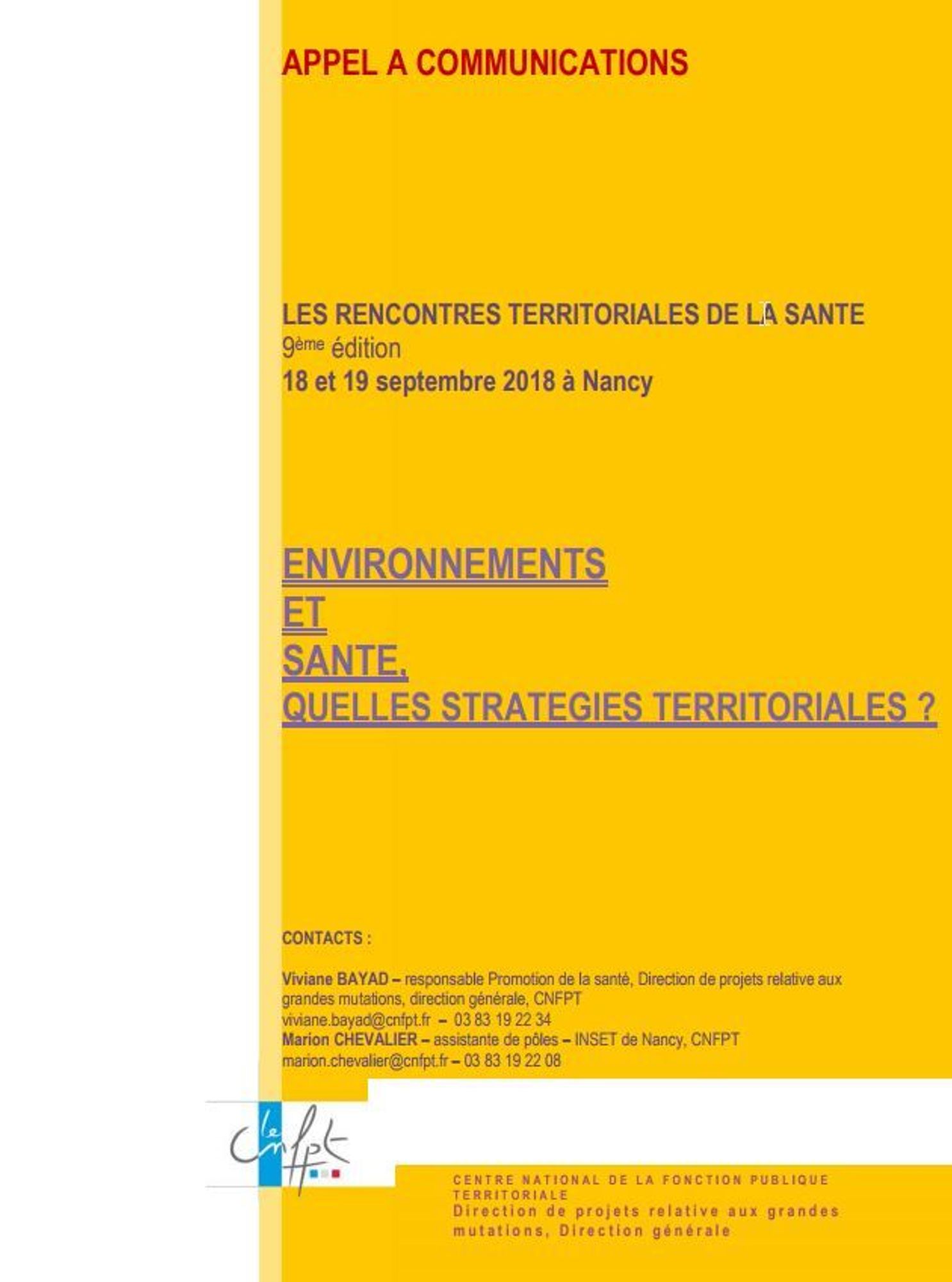 Le Centre national de la fonction publique territoriale (CNFPT) organise ses 9èmes rencontres. Elles s’adressent à l’ensemble des acteurs dont l’activité participe à l’organisation de la santé au niveau territorial : Professionnels intervenant dans le champ de la santé, de l’environnement, du social, de l’urbanisme, de l’habitat, de l’action éducative ; responsables de service, coordinateurs ou chargés de mission santé ; animateurs de la politique de la ville ; élus ; associations d’usagers, de quartier, conseils citoyens, associations et organismes œuvrant dans le champ de la promotion de la santé ; agents de l’Etat et de l’hospitalier. La thématique sera déclinée à travers table ronde, conférences et ateliers. Les 20 ateliers seront construits à partir des communications sélectionnées par le comité de pilotage.