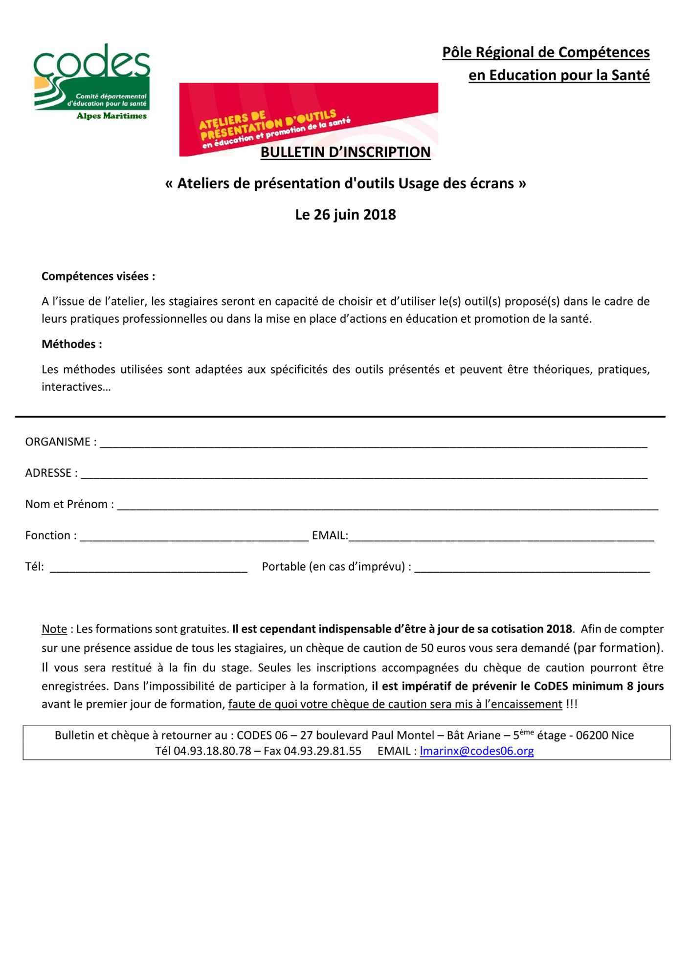 Bulletin d'inscription et chèque de caution de 50 € à renvoyer au CODES 06 avant le 21 juin 2018