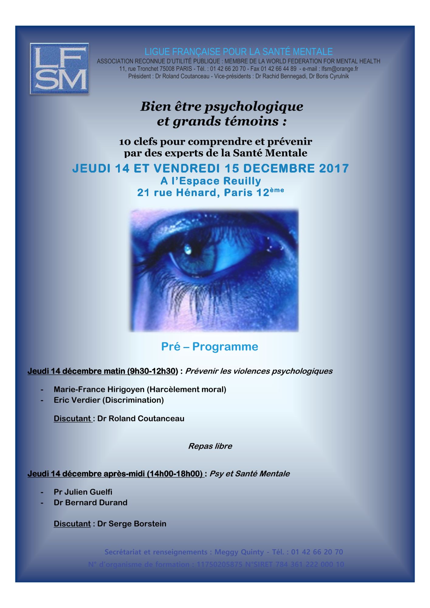 La Ligue Française pour la Santé Mentale organise son prochain colloque "Bien être psychologique et grands témoins : 10 clefs pour comprendre et prévenir par des experts de la santé mentale"
