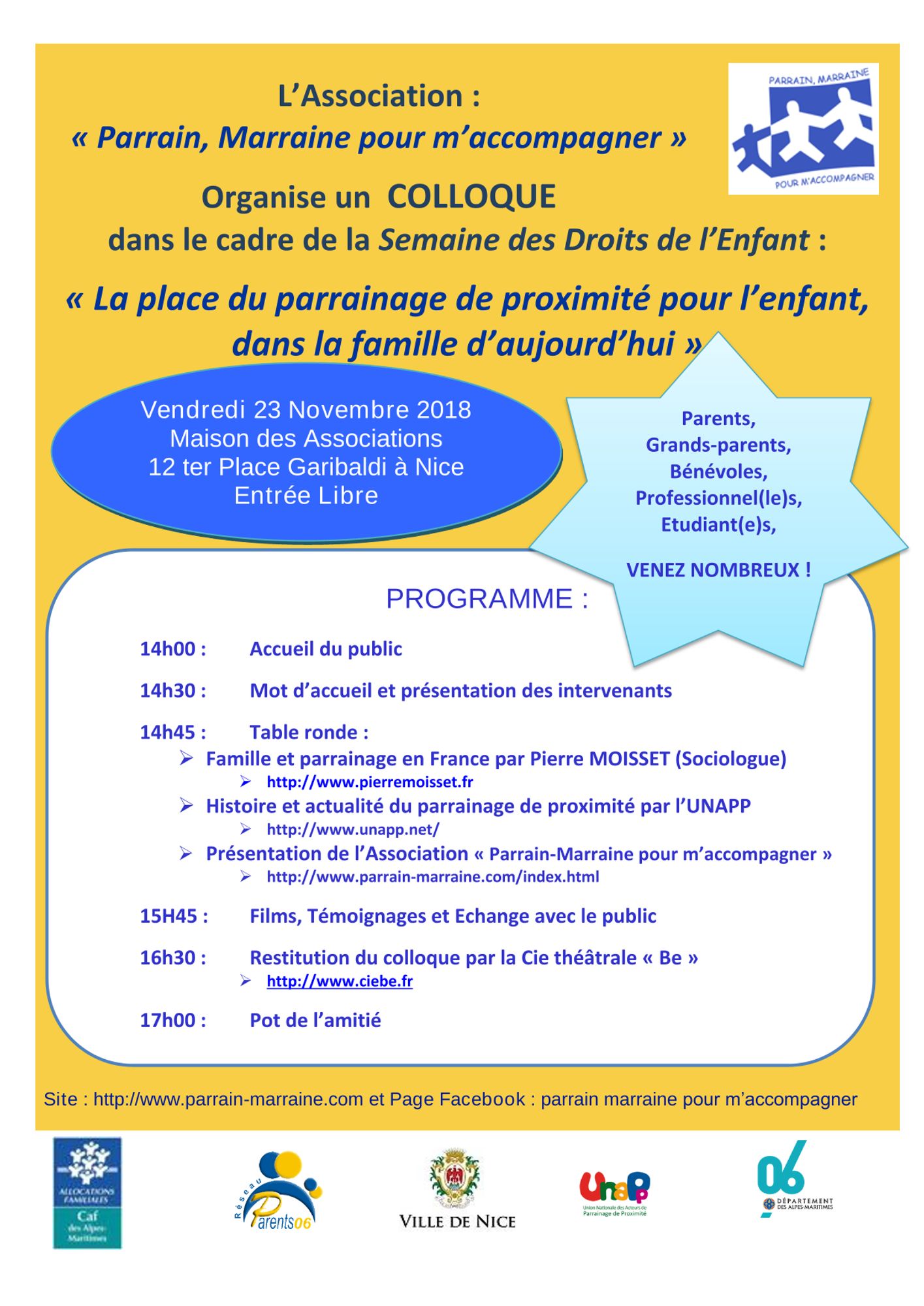 "La place du parrainage de proximité pour l'enfant dans la famille d'aujourd'hui" le vendredi 23 Novembre 2018 de 14h00 à 17h00, à la Maison des Associations, 12 ter Place Garibaldi, à Nice.