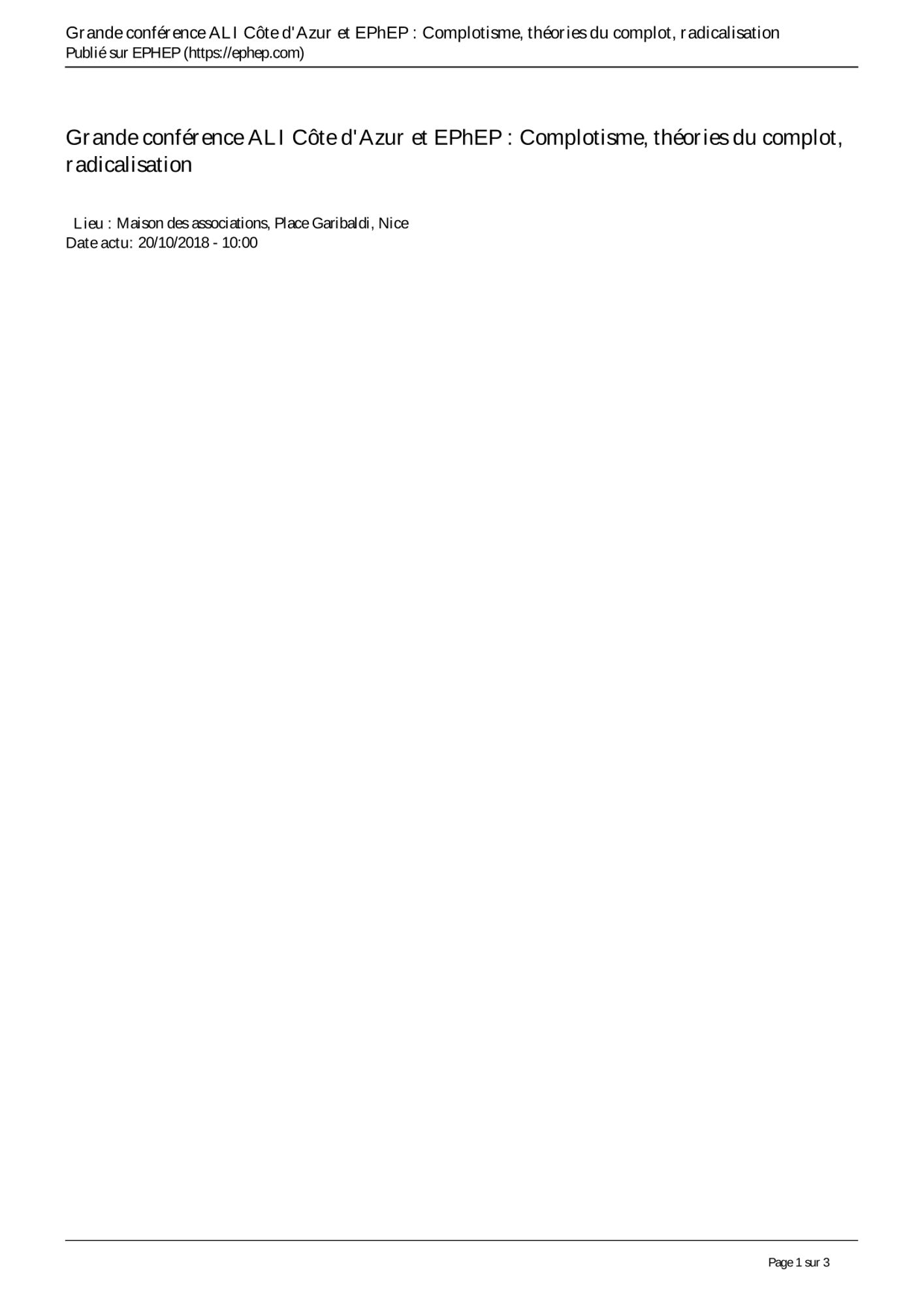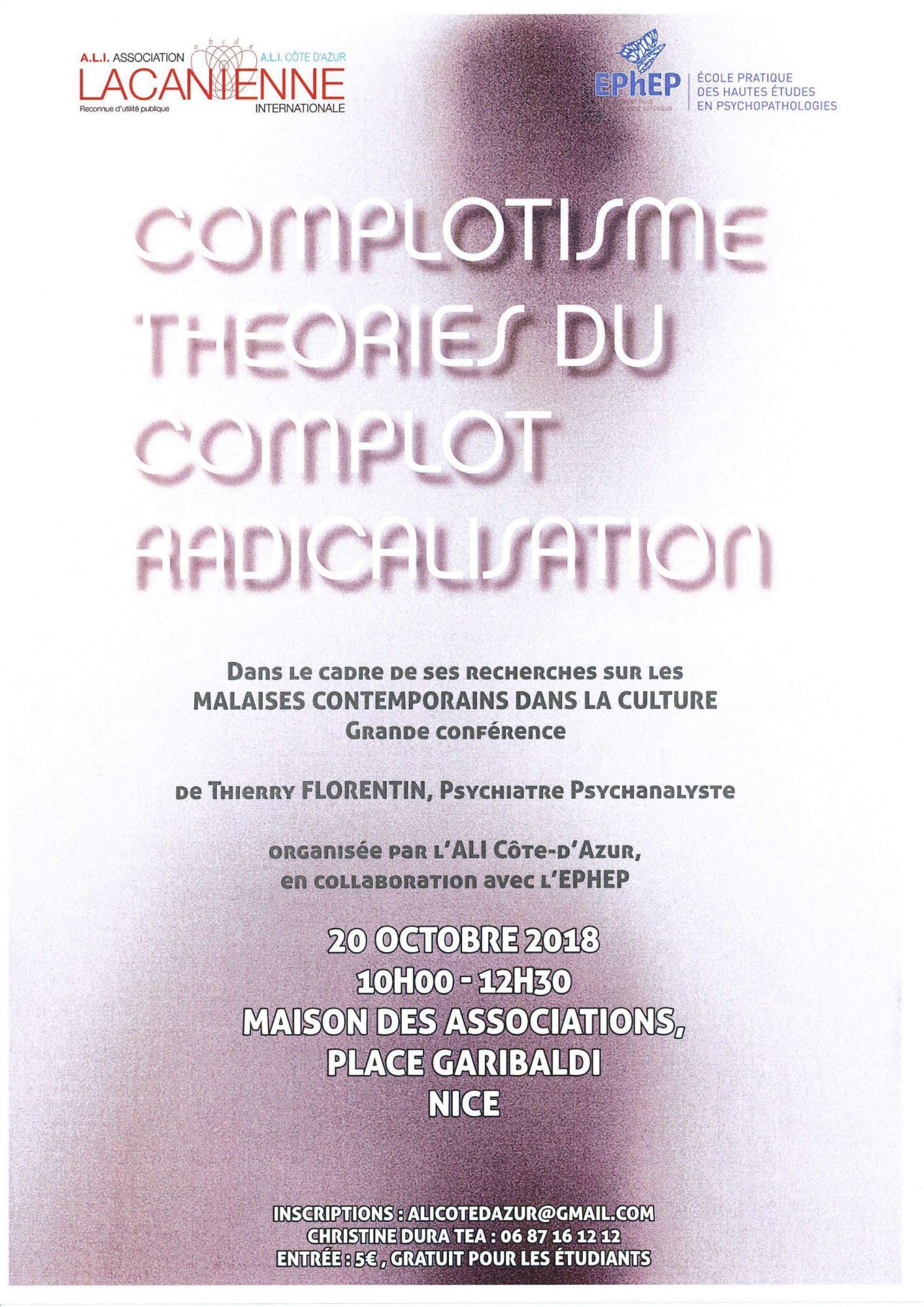 Dans le cadre de ses recherches sur les malaises contemporains dans la culture, l'ALi côte d'azur et l'EPHEP organise une grade conférence sur "Complotisme théories du complot radicalisation" le 20 octobre 2018 de 10h à 12h30 à la maison des associations place Garibaldi à Nice, en présence de Thierry Florentin , psychiatre psychanalyste.