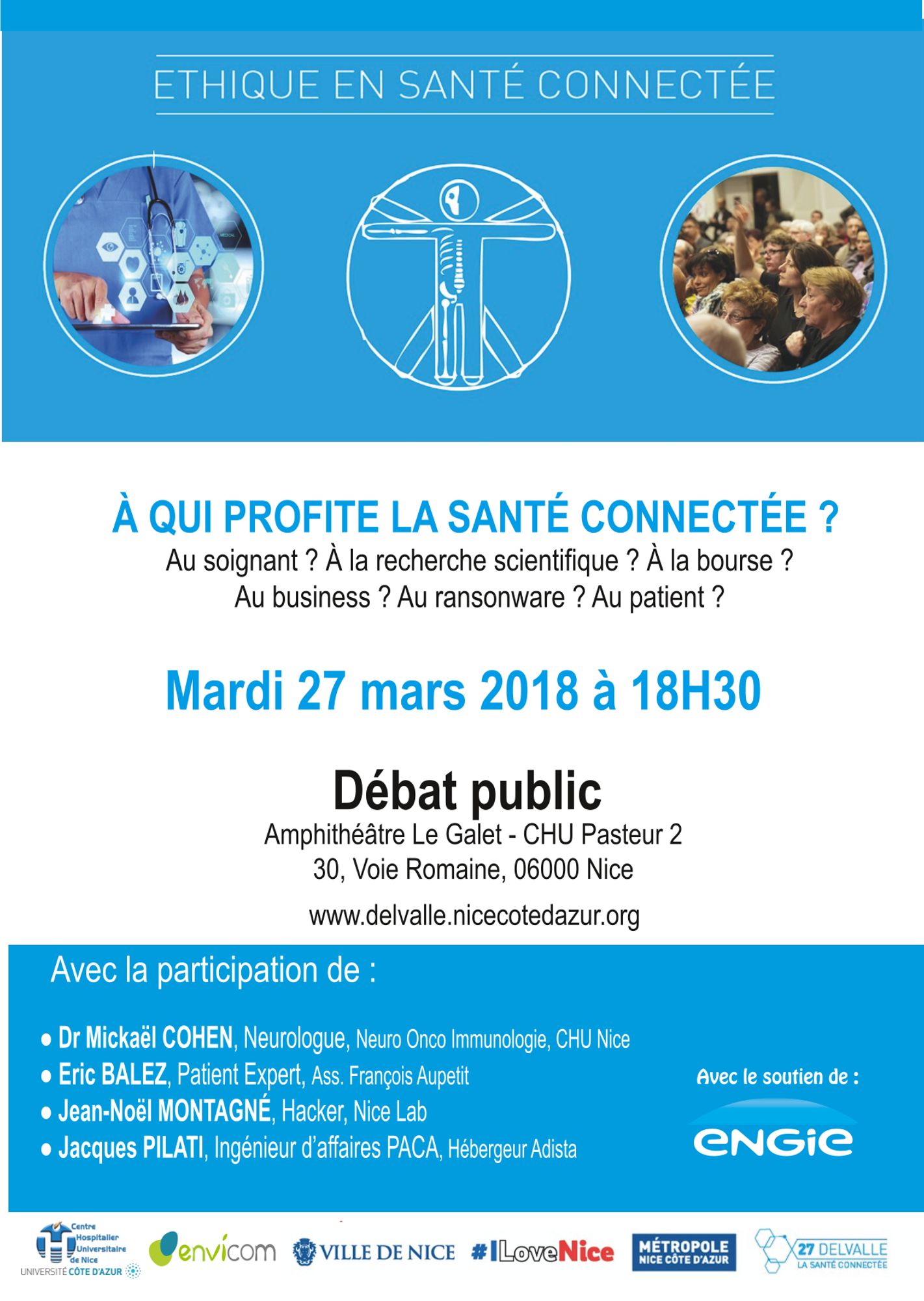 Débat public sur le thème « A qui profite la santé connectée » qui se tiendra le mardi 27 mars à 18h30 au CHU Pasteur 2
