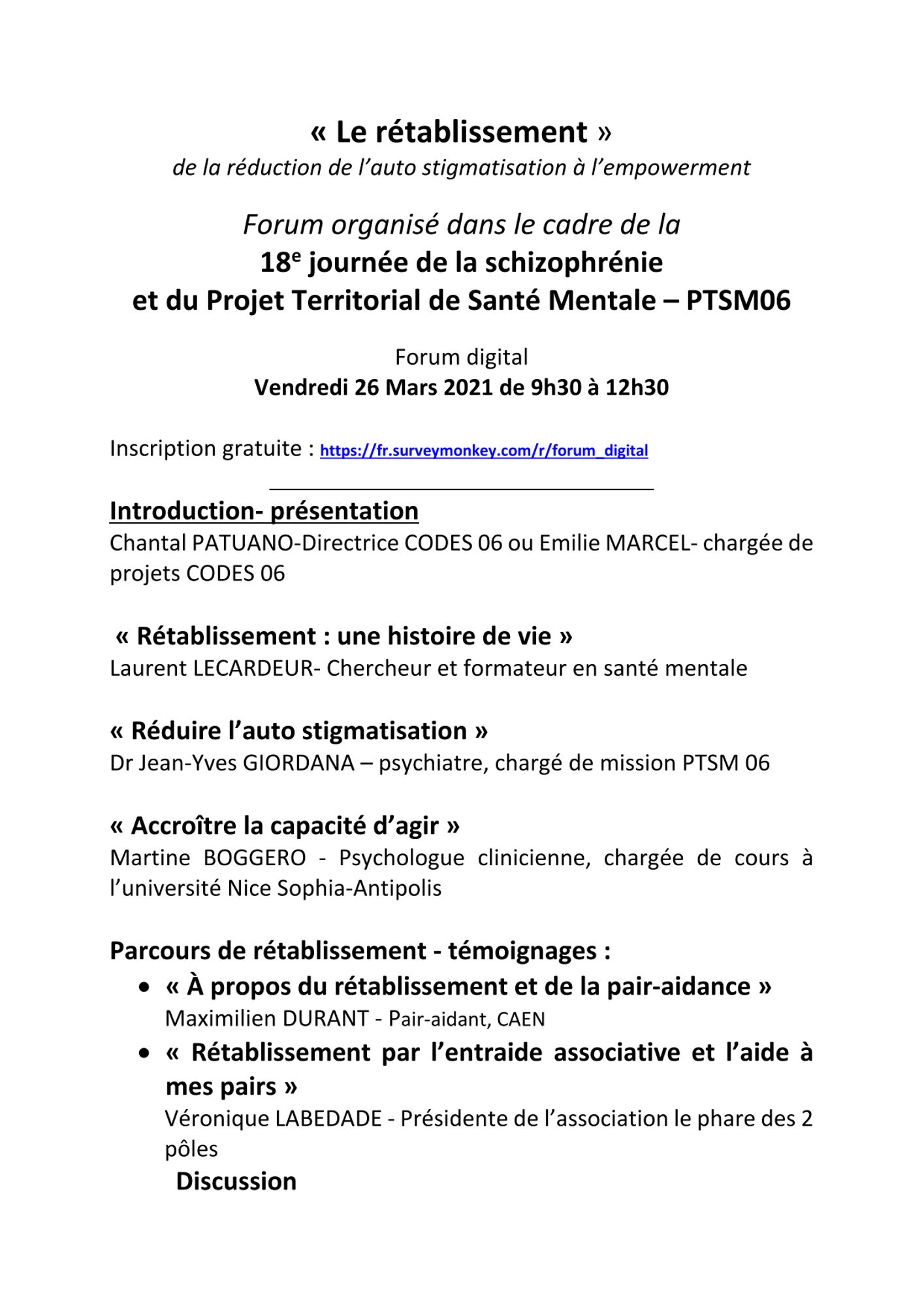 Dans le cadre de la 18e journée de la schizophrénie ayant pour thème : « Se rétablir : c’est quoi ce délire ? », le codes 06 qui porte un ensemble de réflexions visant à améliorer l’efficience des actions de prévention, de repérage précoce de la souffrance psychique mais aussi de la qualité des prises en charge et des accompagnements de personnes souffrant d’affections psychiques, propose un forum digital traitant du processus de rétablissement et des perspectives d’inclusion sociale. L’approche conceptuelle sera complétée par des témoignages d’usagers.