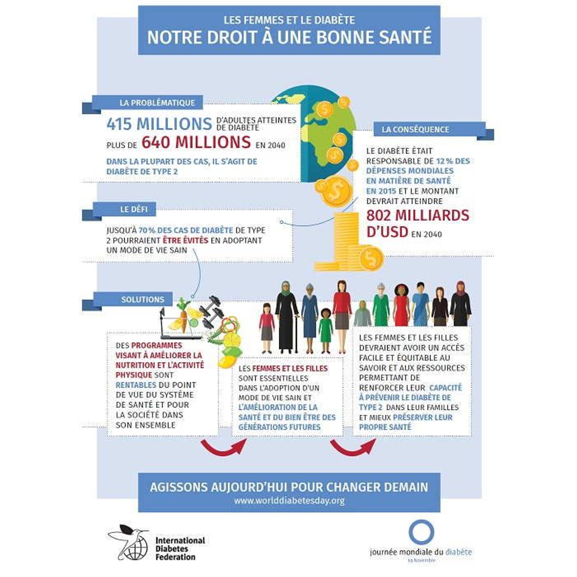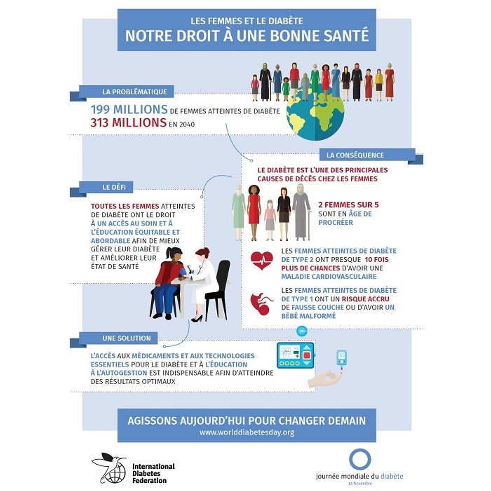 La campagne de la Journée mondiale du diabète de cette année veut appuyer sur l’importance d’un accès abordable et équitable pour toutes les femmes atteintes de diabète ou à risque aux traitements et moyens essentiels pour gérer, ou prévenir le diabète qu’ils soit de type 1, de type 2 ou le diabète gestationnel. Ainsi qu’un accès à l’éducation à l’information dont elles ont besoin pour prévenir le diabète de type 2 et le diabète gestationnel.