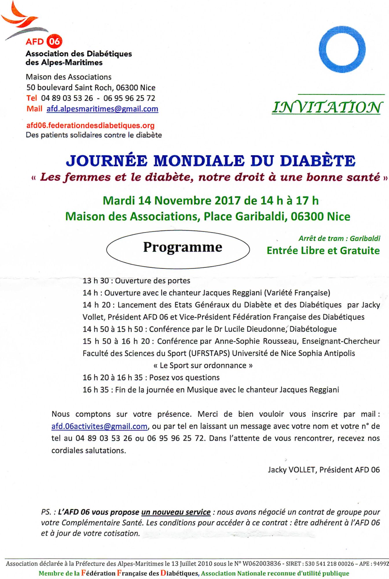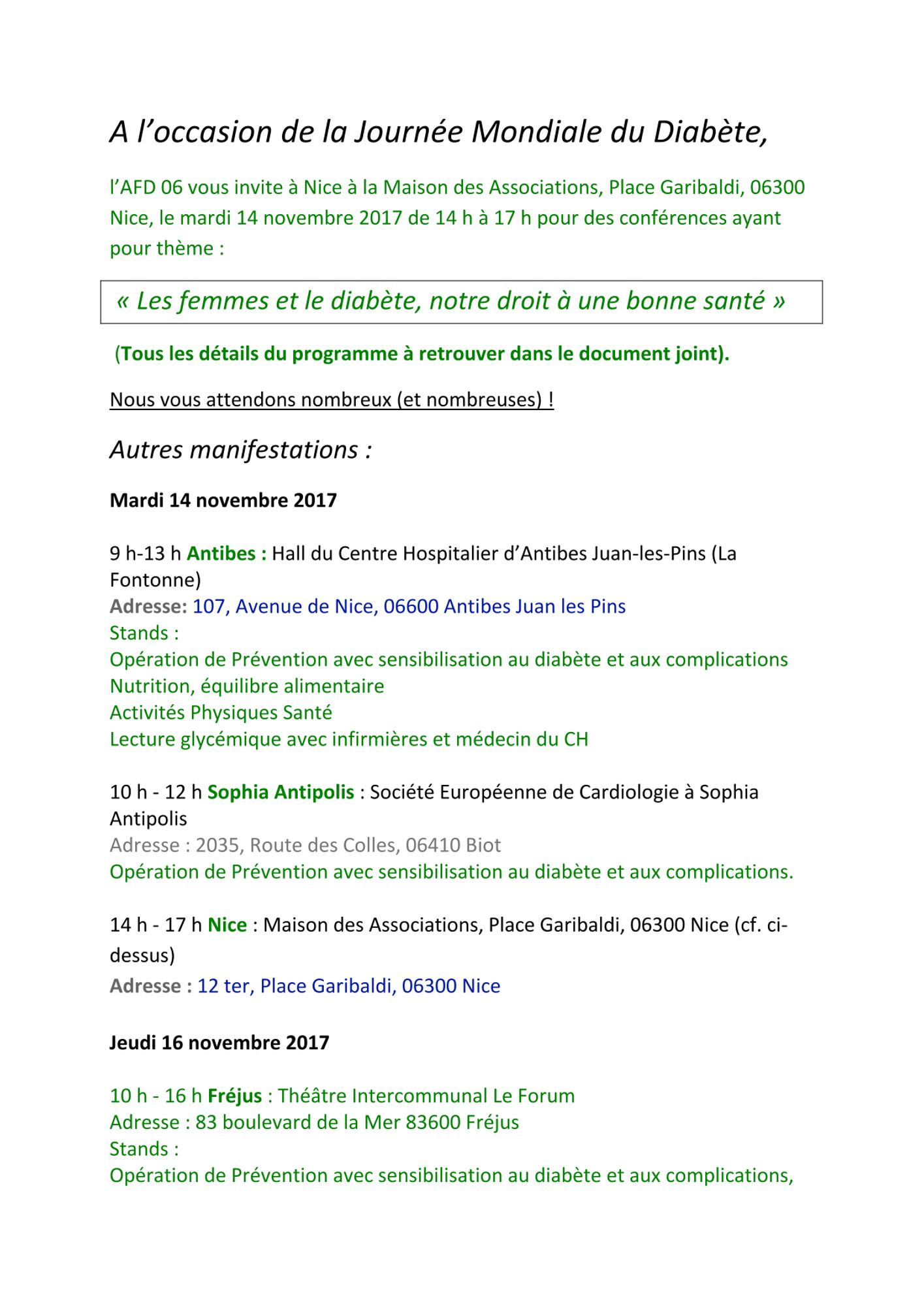 A l'occasion de la Journée Mondiale du Diabète, l'AFD 06 vous invite à Nice à la Maison des Associations, Place Garibaldi, 06300 Nice, le mardi 14 novembre 2017 de 14 h à 17 h pour des conférences ayant pour thème : « Les femmes et le diabète, notre droit à une bonne santé »