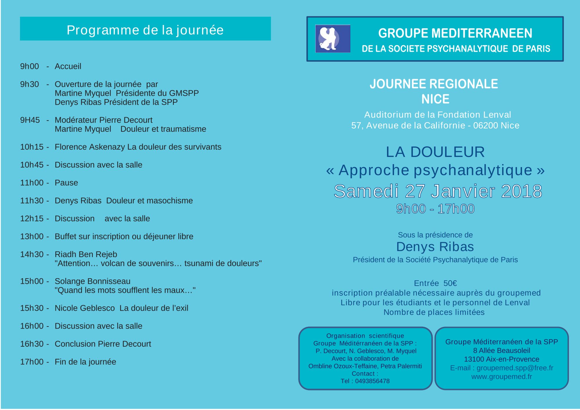 Le thème de cette journée nous est apparu comme évident après l’attentat de Nice La douleur qui suivit, atteignit tout le monde, les victimes, leur famille les soignants, toute la population, et même les touristes, et ce de façon durable. Les italiens habituellement très nombreux le week-end à Nice ont disparu, Nice ne pouvait plus être le symbole de la fête, mais était devenu celui de la douleur et de l’horreur..