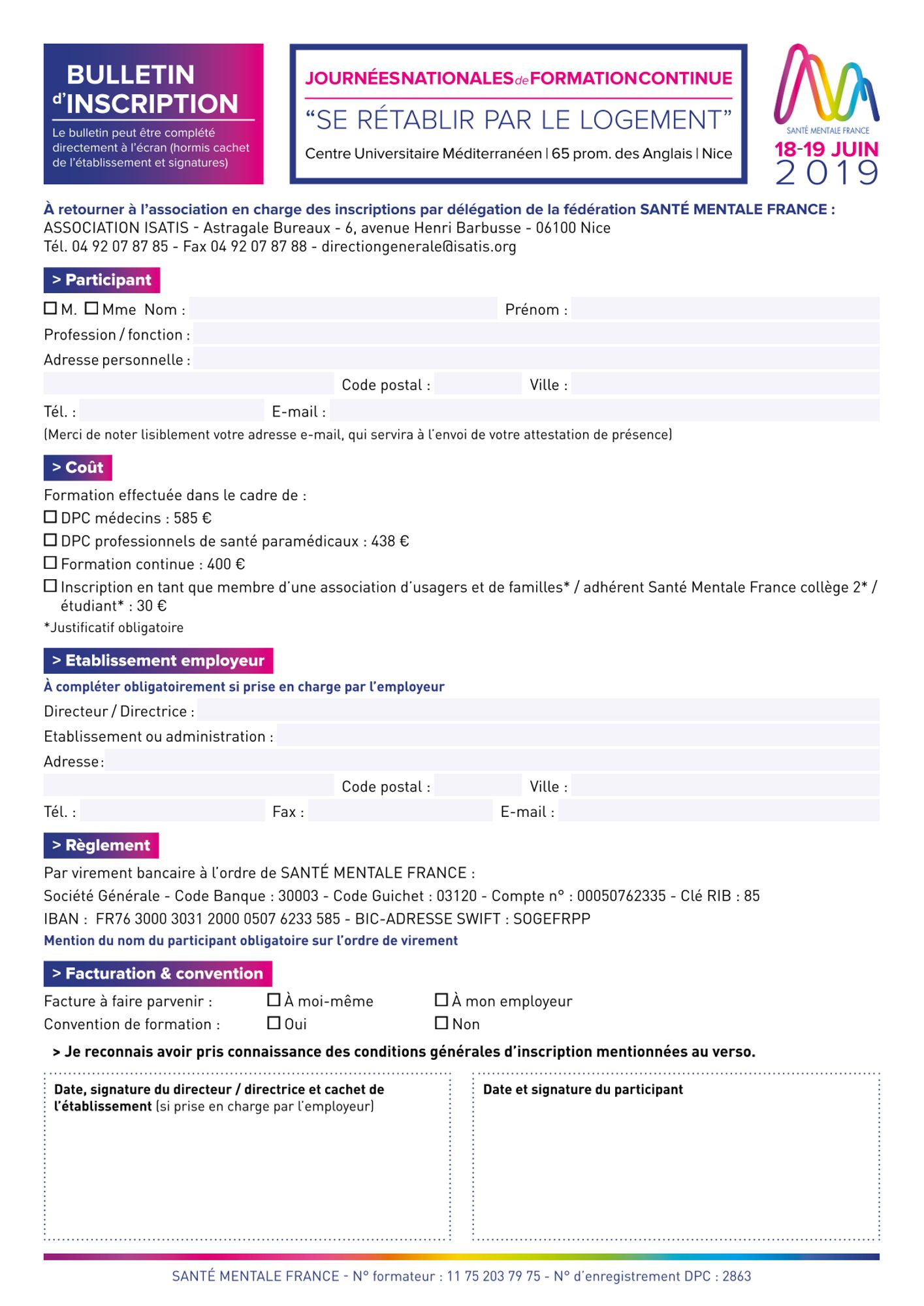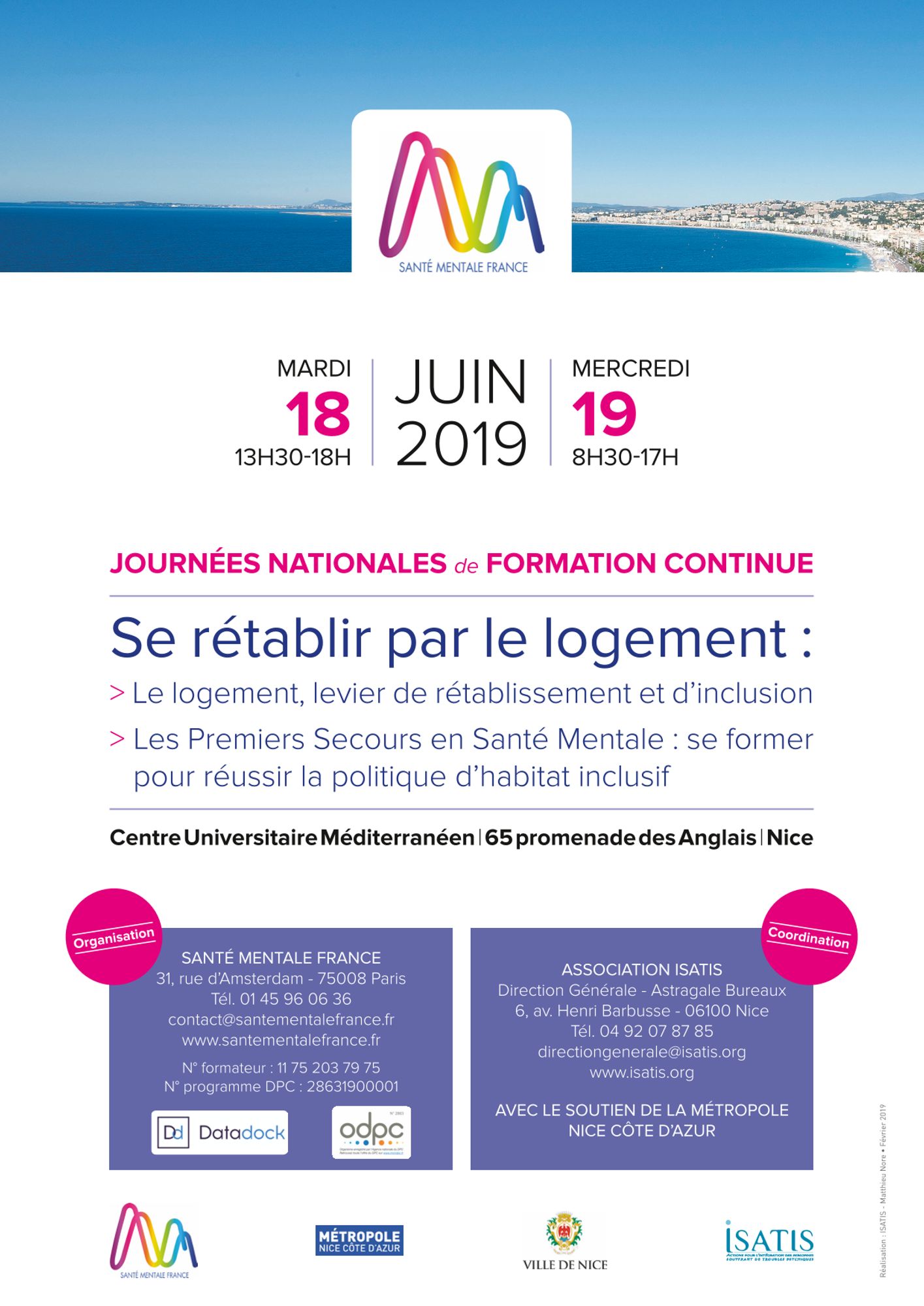 Les journées nationales de formation continue santé mentale France se tiendront au CUM à Nice les 18 et 19 juin 2019 avec pour thème Se rétablir par le logement :