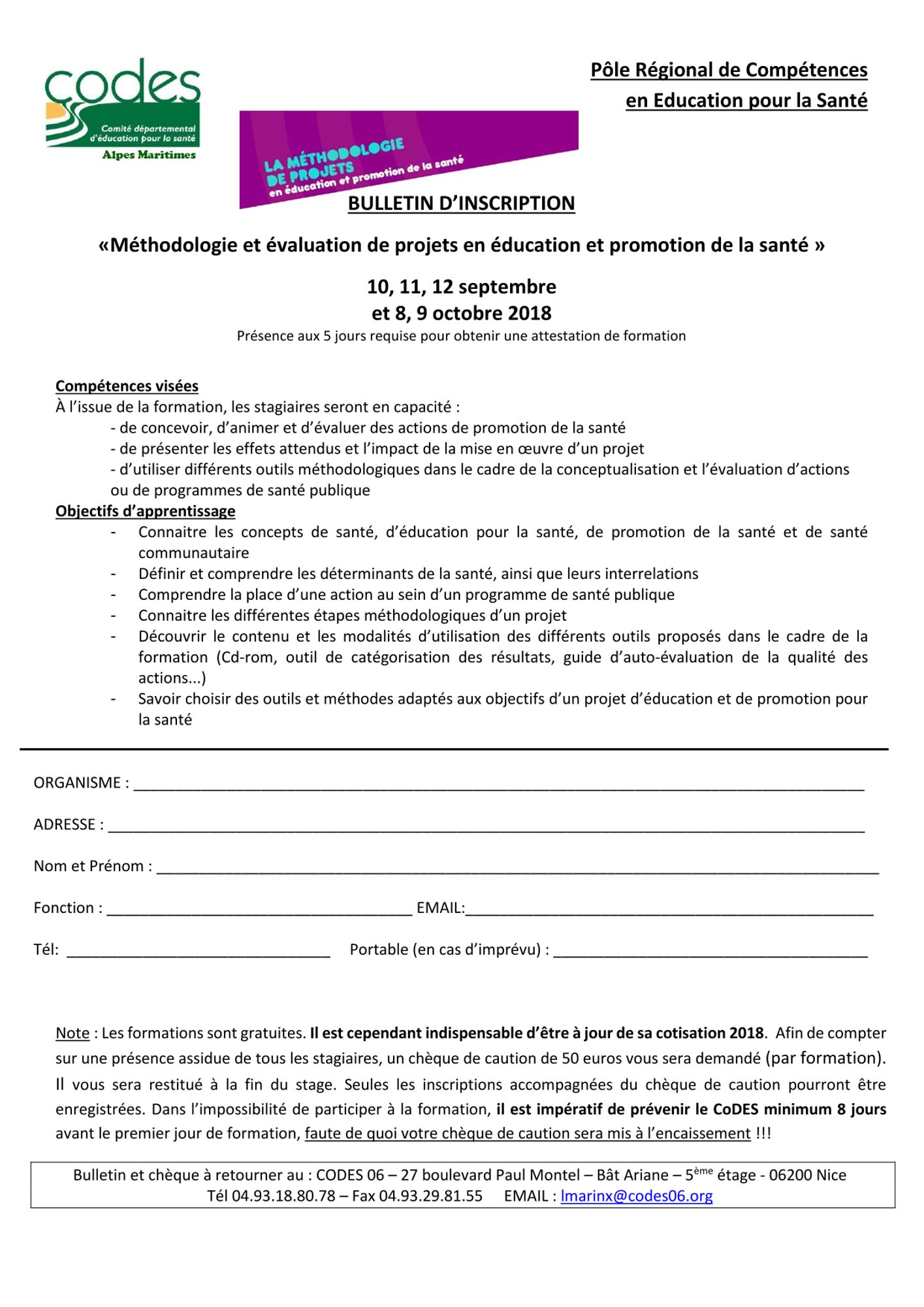 Bulletin d'inscription et chèque de caution de 50 € à renvoyer au CODES 06 avant le 05 septembre 2018