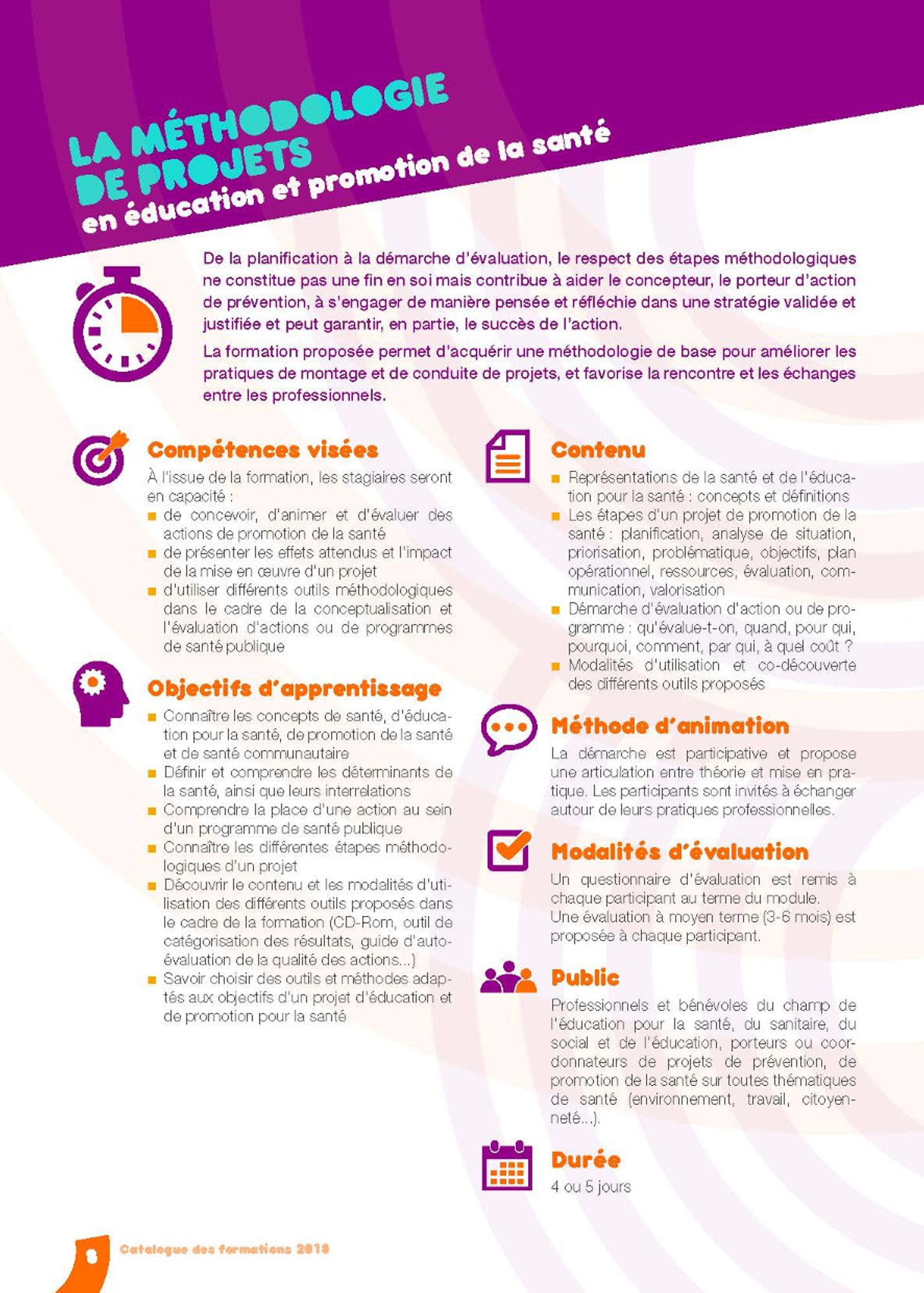De la planification à la démarche d’évaluation, le respect des étapes méthodologiques ne constitue pas une fin en soi mais contribue à aider le concepteur, le porteur d’action de prévention, à s’engager de manière pensée et réfléchie dans une stratégie validée et justifiée et peut garantir, en partie, le succès de l’action. La formation proposée permet d’acquérir une méthodologie de base pour améliorer les pratiques de montage et de conduite de projets, et favorise la rencontre et les échanges entre les professionnels.