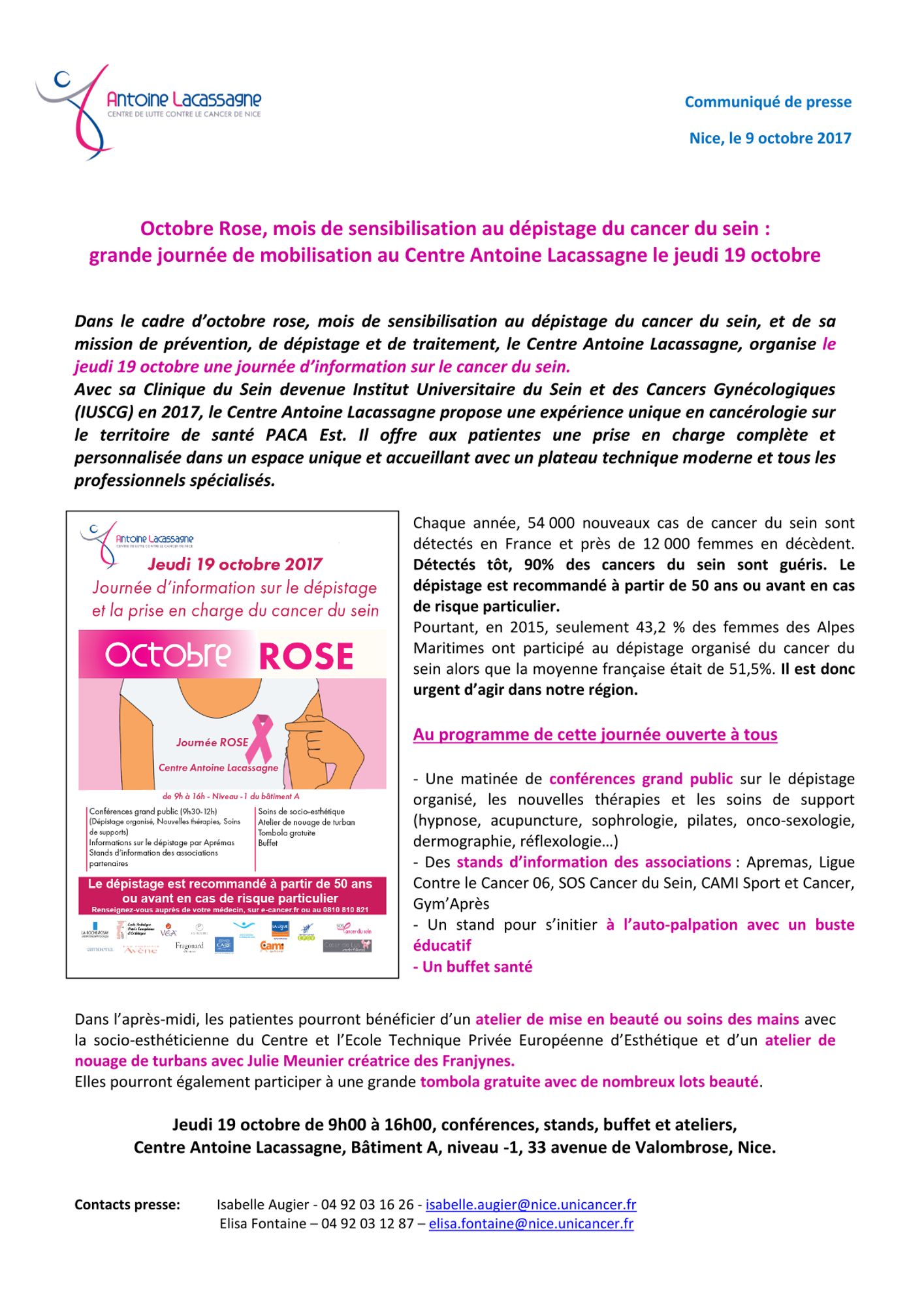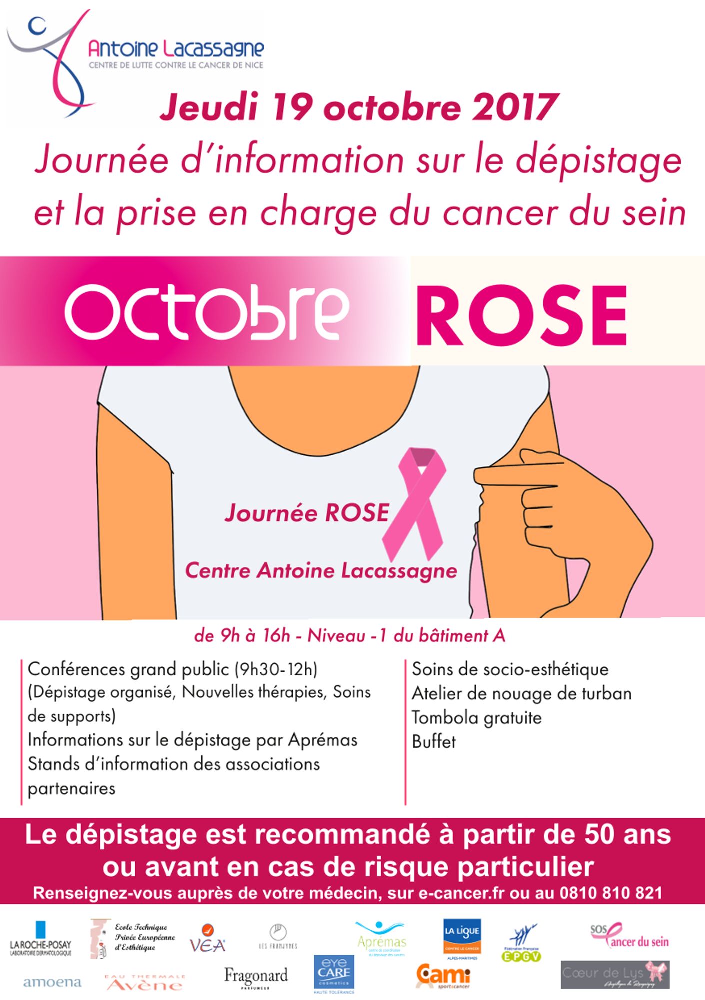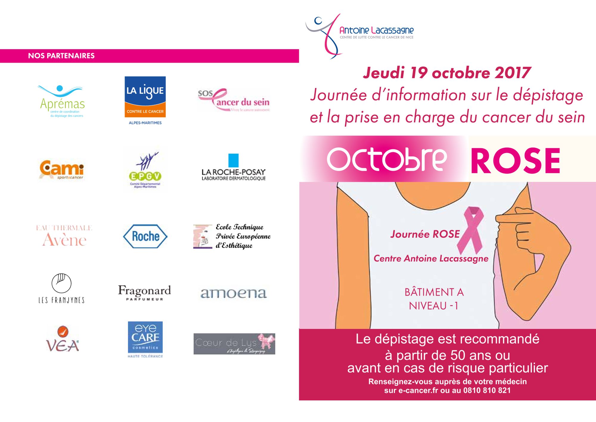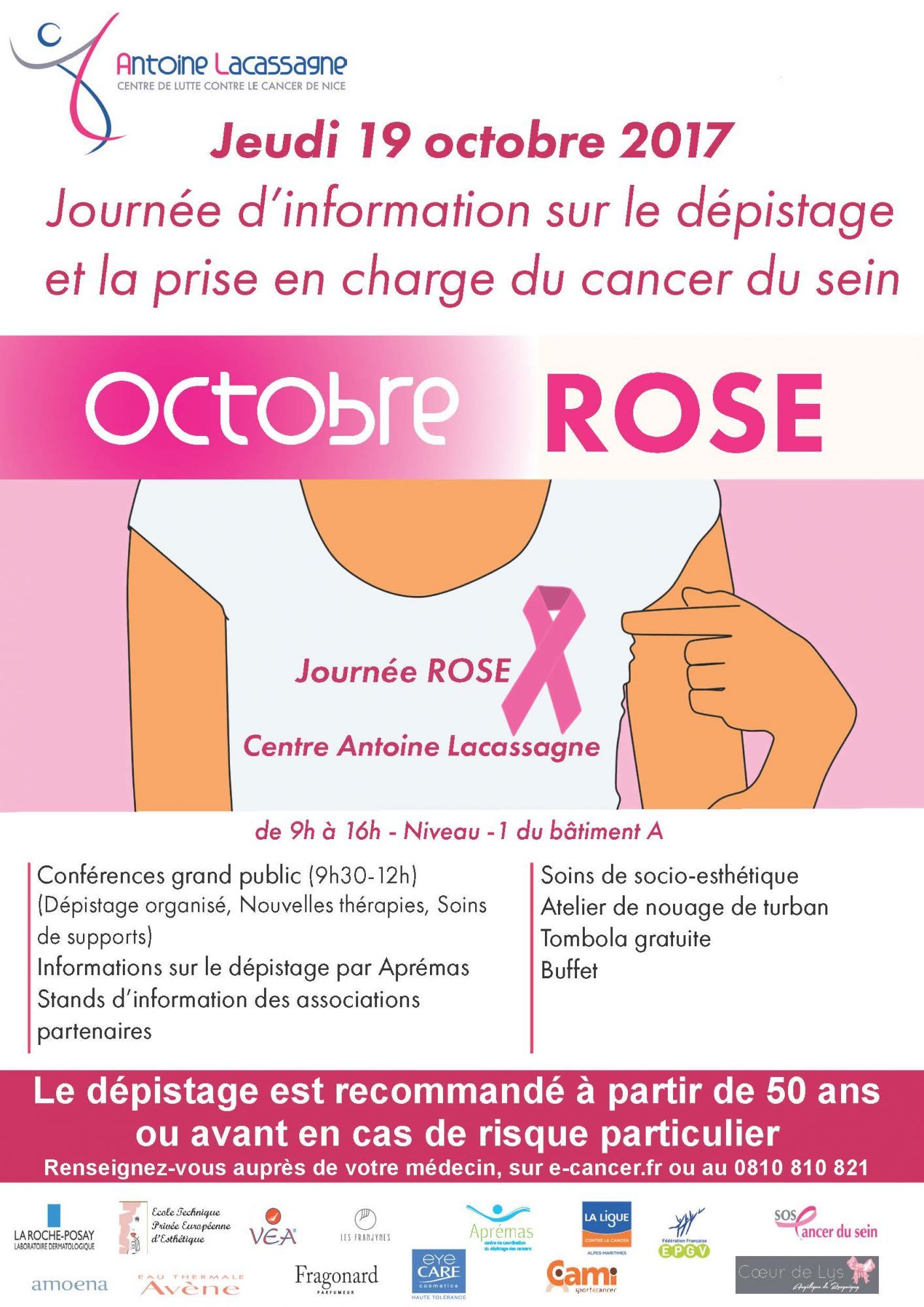 Dans le cadre d’octobre rose, mois de sensibilisation au dépistage du cancer du sein, et de sa mission de prévention, de dépistage et de traitement, le Centre Antoine Lacassagne, organise le jeudi 19 octobre une journée d’information sur le cancer du sein.