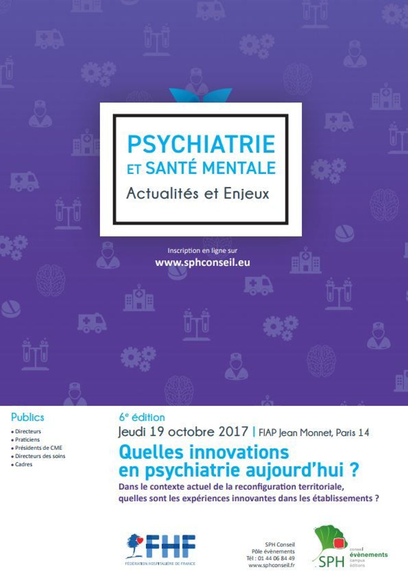 L’objectif de cette journée annuelle est de traiter des principales problématiques de la psychiatrie et de la santé mentale dans les domaines juridiques, politiques, financiers, stratégiques et organisationnels.