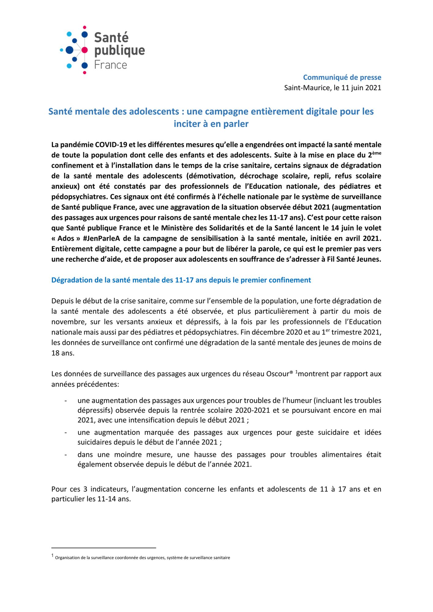 C’est pour cette raison que Santé publique France et le Ministère des Solidarités et de la Santé lancent le 14 juin le volet « Ados » #JenParleA de la campagne de sensibilisation à la santé mentale, initiée en avril 2021. Entièrement digitale, cette campagne a pour but de libérer la parole, ce qui est le premier pas vers une recherche d’aide, et de proposer aux adolescents en souffrance de s’adresser à Fil Santé Jeunes.