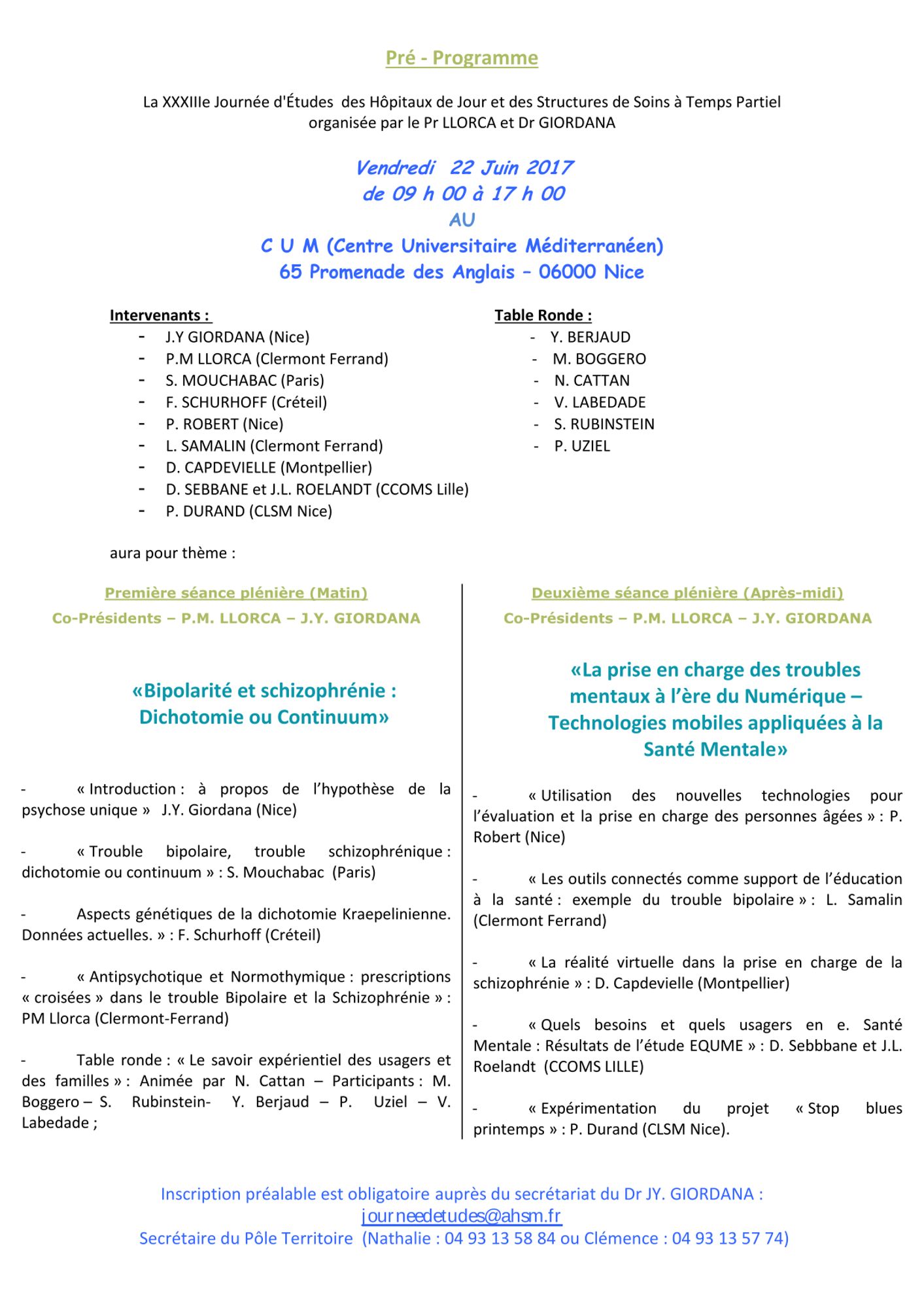 L’inscription préalable est obligatoire auprès du secrétariat du Dr JY. GIORDANA journeedetudes@ahsm.fr