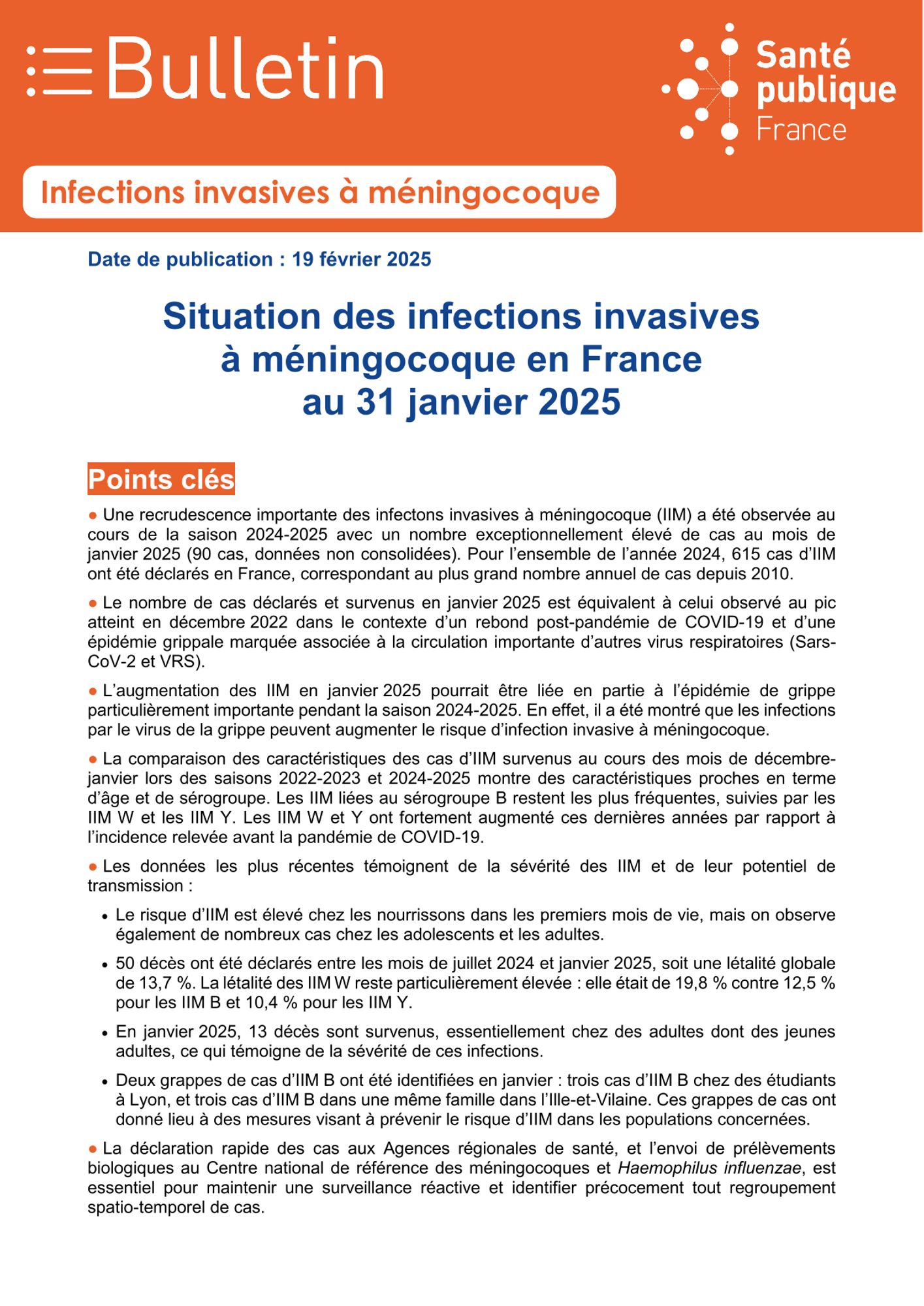 Deux grappes de cas d’IIM B ont été identifiées en janvier : trois cas d’IIM B chez des étudiants à Lyon, et trois cas d’IIM B dans une même famille dans l’Ille-et-Vilaine. Ces grappes de cas ont donné lieu à des mesures visant à prévenir le risque d’IIM dans les populations concernées. - La déclaration rapide des cas aux Agences régionales de santé, et l’envoi de prélèvements biologiques au Centre national de référence des méningocoques et Haemophilus influenzae, est essentiel pour maintenir une surveillance réactive et identifier précocement tout regroupement spatio-temporel de cas. [Résumé éditeur]