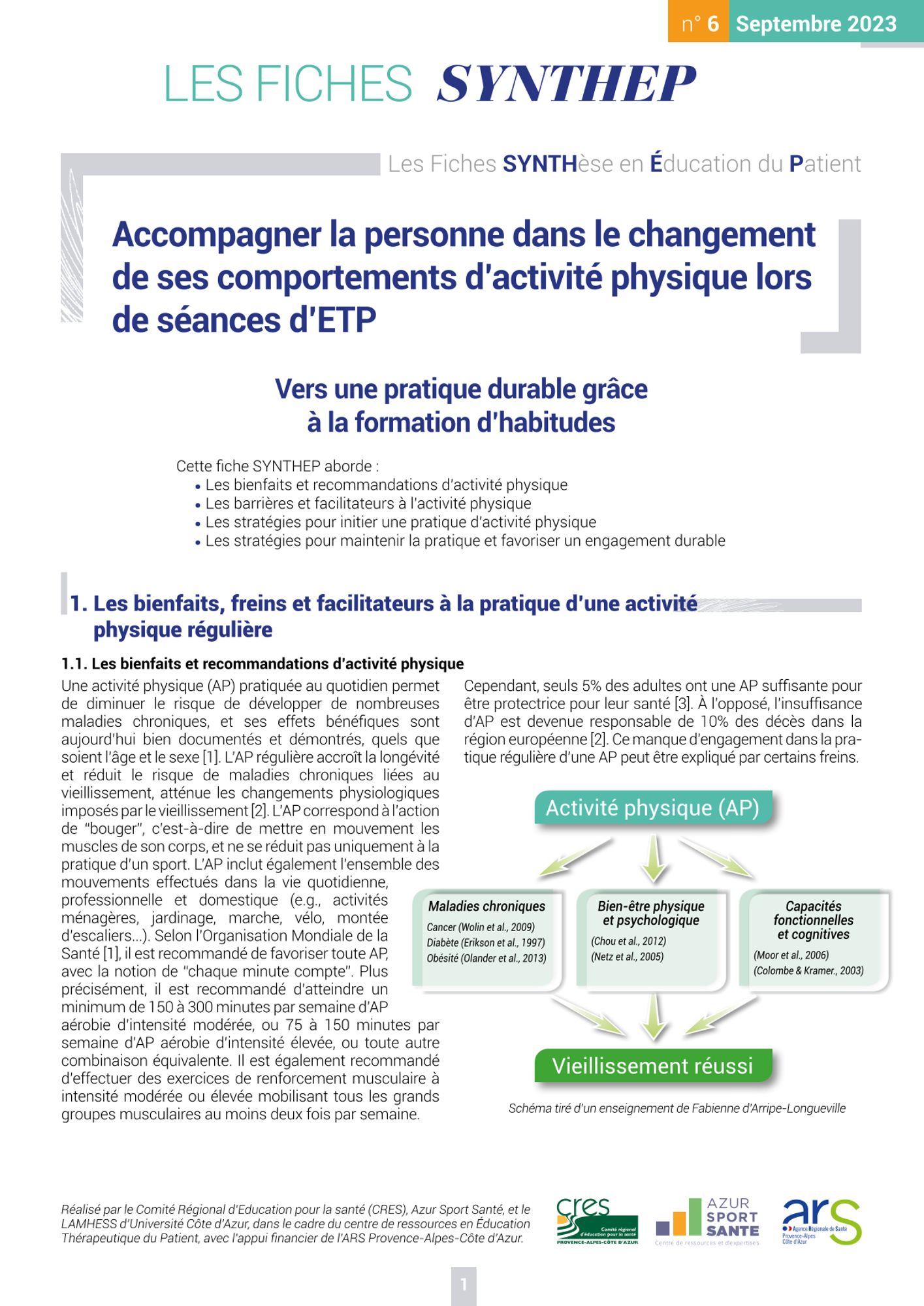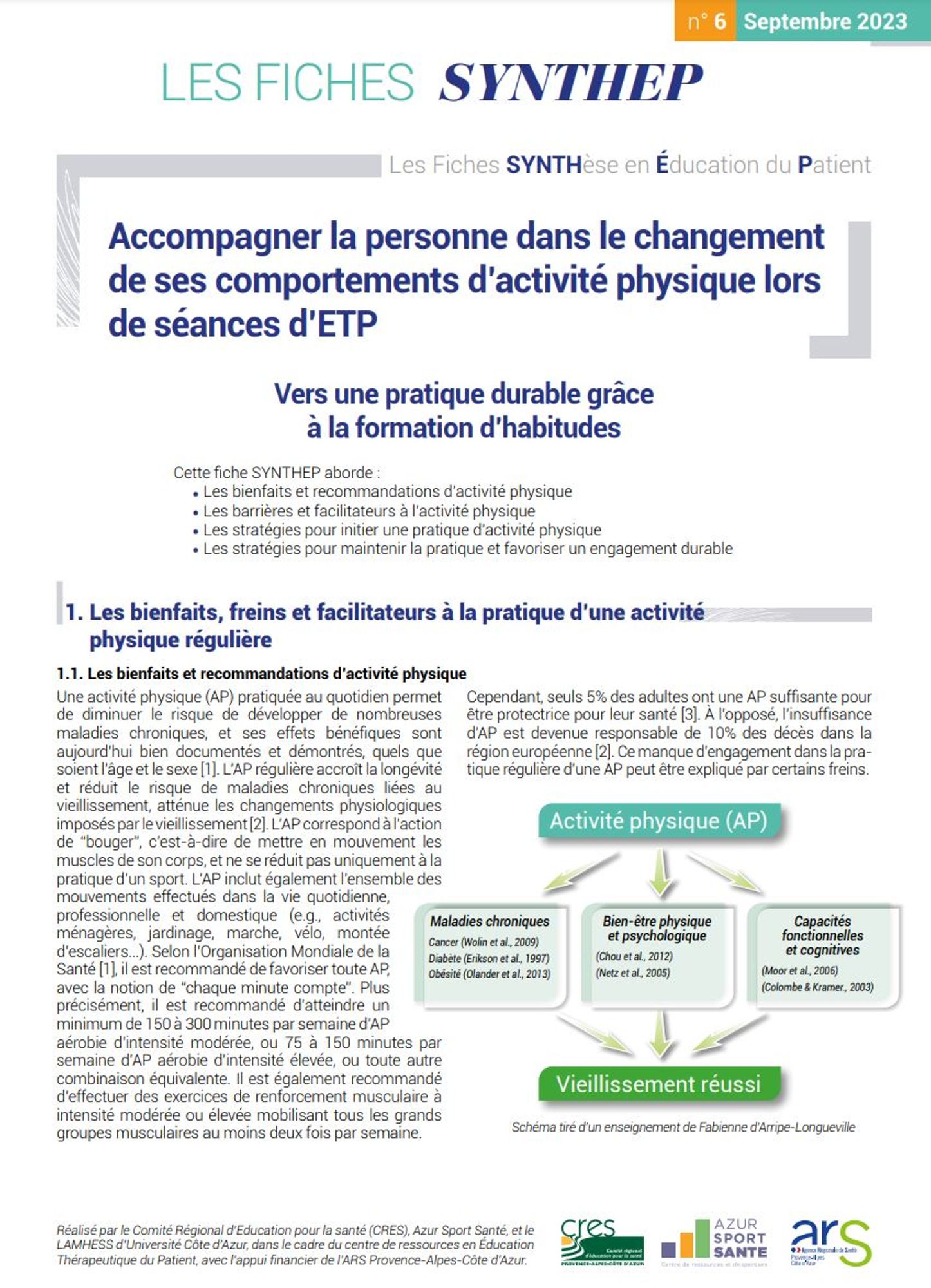 Fabienne d'Arripe-Longueville, Marion Fournier, Meggy Hayotte (et al.), Accompagner la personne dans le changement de ses comportements d’activité physique lors de séances d’ETP. Vers une pratique durable grâce à la formation d'habitudes, CRES Provence-Alpes-Côte d'Azur, ARS Provence-Alpes-Côte d'Azur, Les Fiches Synthep. Les fiches synthèse en éducation du patient, n° 6, 2023-01, 7 p.