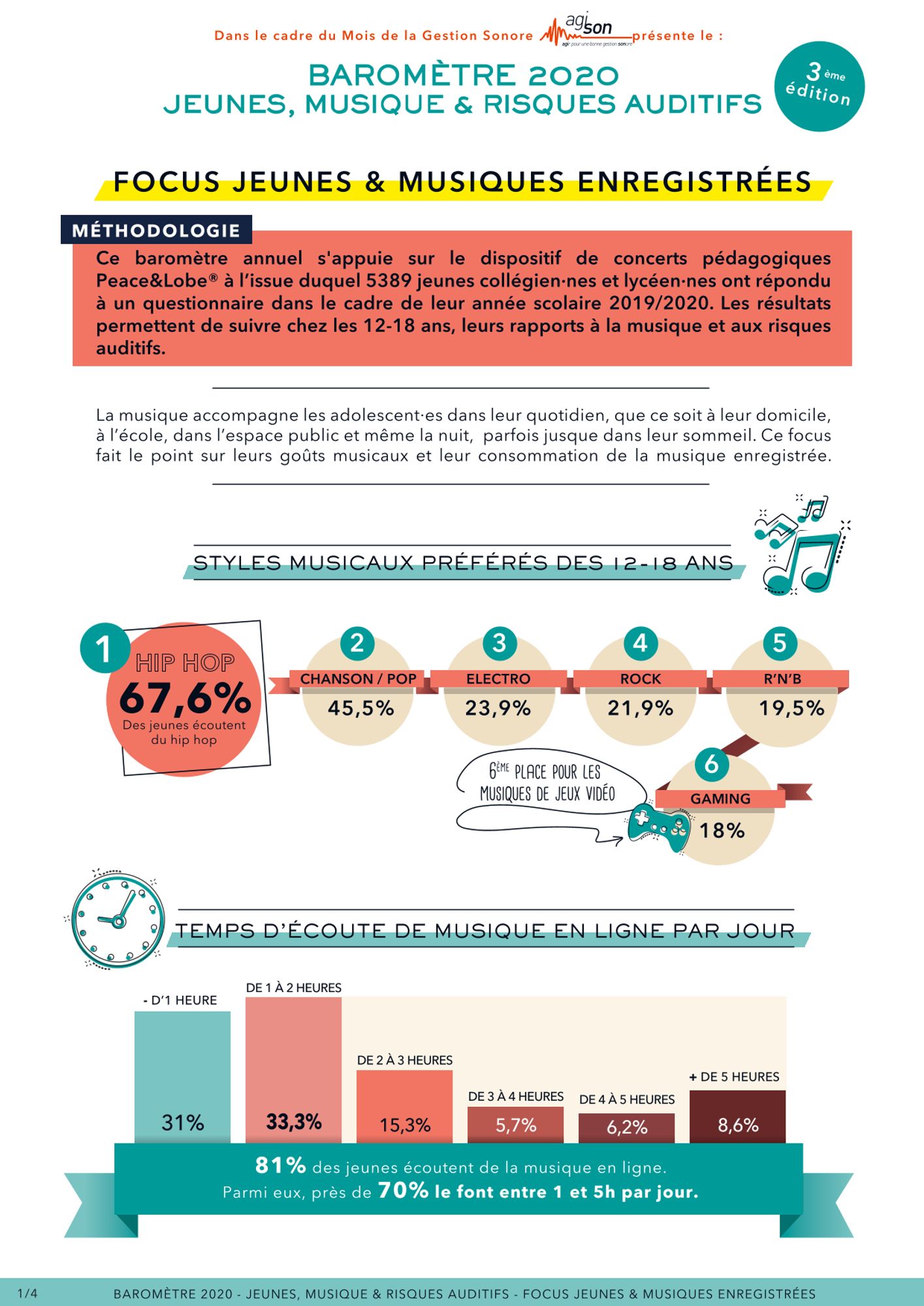 Ce baromètre annuel s'appuie sur le dispositif de concerts pédagogiques Peace&Lobe® à l’issue duquel 5389 jeunes collégien·nes et lycéen·nes ont répondu à un questionnaire dans le cadre de leur année scolaire 2019/2020. Les résultats permettent de suivre chez les 12-18 ans, leurs rapports à la musique et aux risques auditifs.