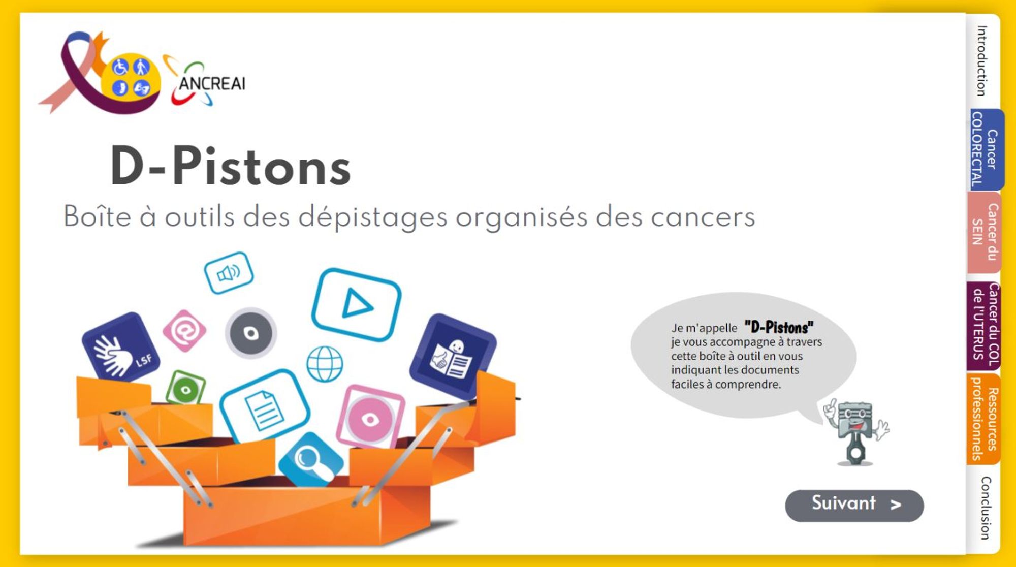 Cette boîte à outils a été élaborée dans le cadre d’un projet de recherche visant à mieux comprendre pourquoi les personnes en situation de handicap de plus de 50 ans participent deux fois moins aux programmes de dépistage organisé des cancers par rapport à la population générale. Elle s’adresse aux personnes en situation de handicap et leurs aidants, aux professionnels des établissements sanitaires et médico-sociaux (ESMS), aux professionnels de la santé et aux centres de coordination régionaux (CRCDC). Elle est divisée en plusieurs chapitres : après une introduction sont abordés le cancer colorectal, le cancer du sein, le cancer du col de l'utérus. Une partie est dédiée spécifiquement aux ressources avant la conclusion. Elle est entièrement en ligne ainsi que tous les supports proposés (vidéos, dépliants etc.)