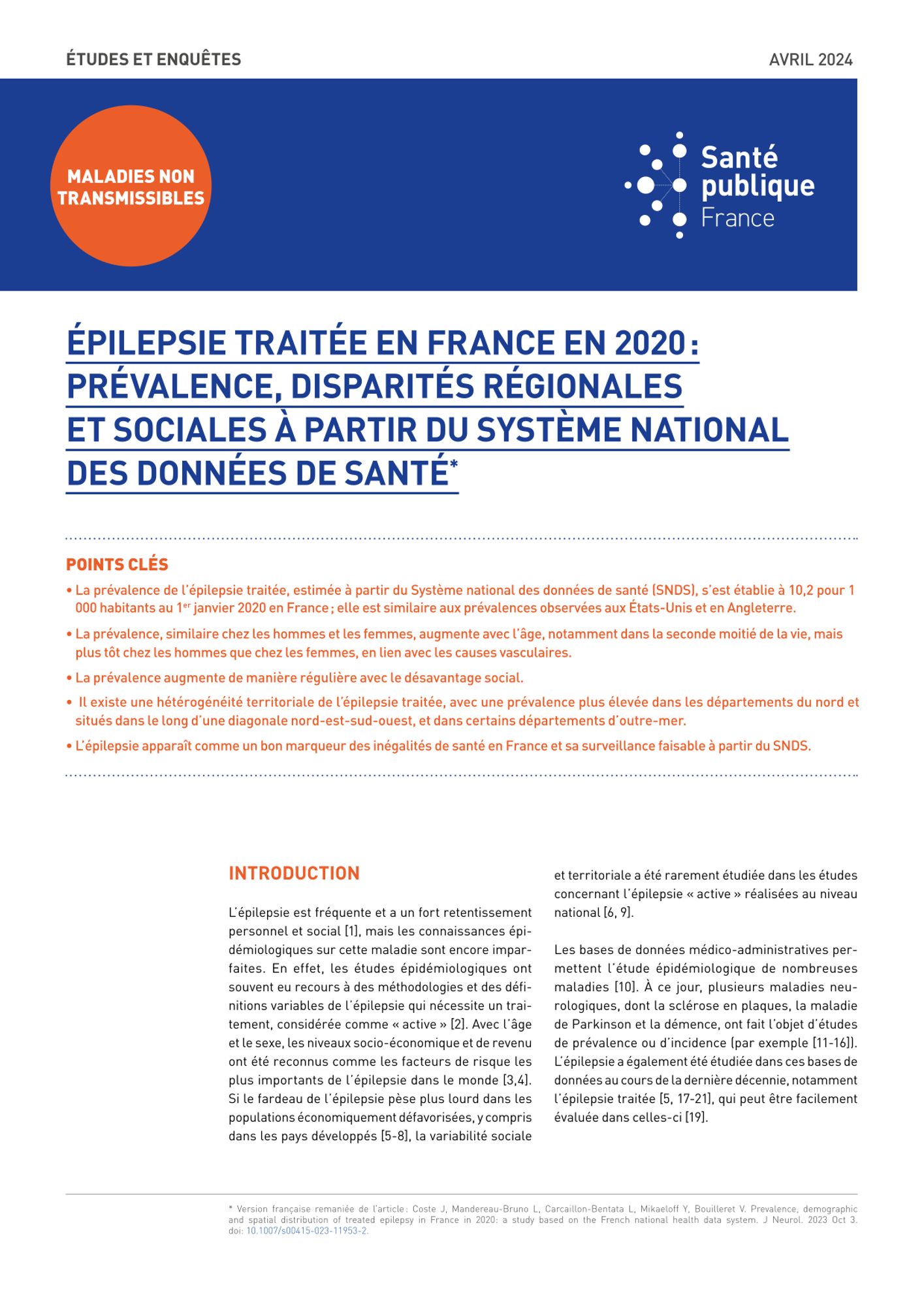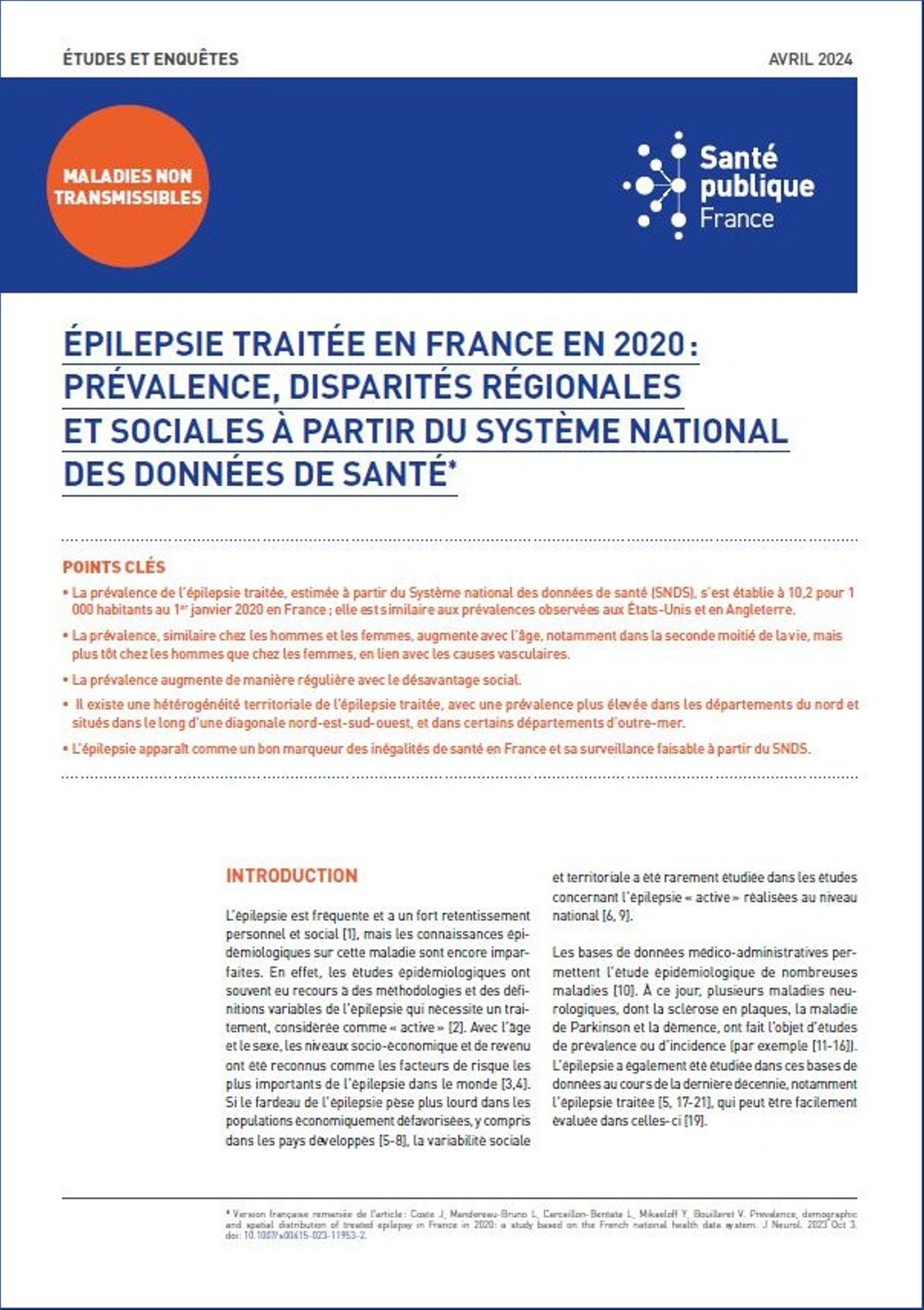 La prévalence de l'épilepsie traitée, estimée à partir du Système national des données de santé (SNDS), s'est établie à 10,2 pour 1 000 habitants au 1er janvier 2020 en France ; elle est similaire aux prévalences observées aux États-Unis et en Angleterre. La prévalence, similaire chez les hommes et les femmes, augmente avec l'âge, notamment dans la seconde moitié de la vie, mais plus tôt chez les hommes que chez les femmes, en lien avec les causes vasculaires. La prévalence augmente de manière régulière avec le désavantage social. Il existe une hétérogénéité territoriale de l'épilepsie traitée, avec une prévalence plus élevée dans les départements du nord et situés dans le long d'une diagonale nord-est-sud-ouest, et dans certains départements d'outre-mer. L'épilepsie apparaît comme un bon marqueur des inégalités de santé en France et sa surveillance faisable à partir du SNDS. (Résumé éditeur)