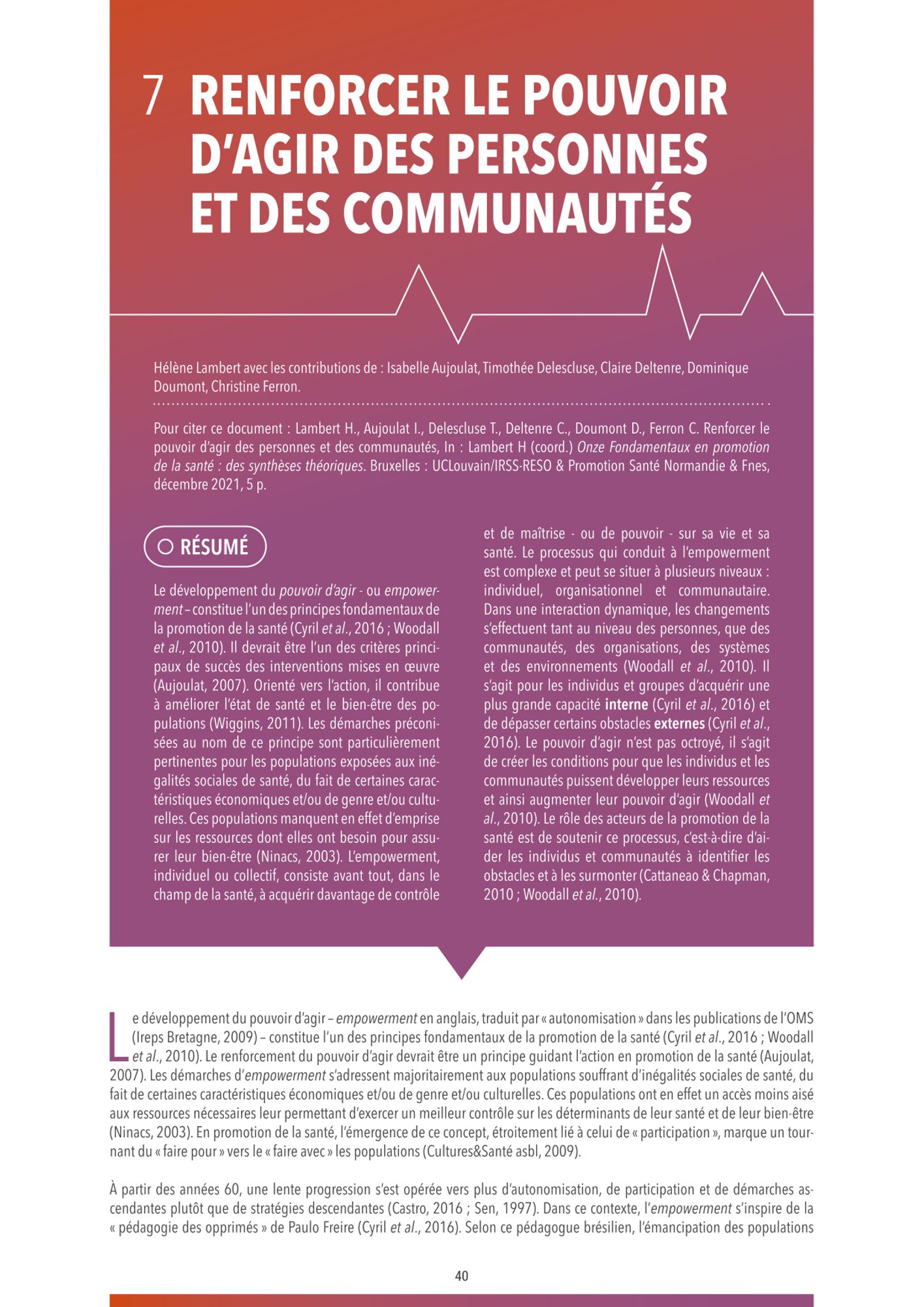 Cette approche conceptuelle et dynamique des principes d’intervention de la promotion de la santé a pour ambition de mettre à la disposition des professionnels des arguments nécessaires pour plaider en faveur de ces principes.