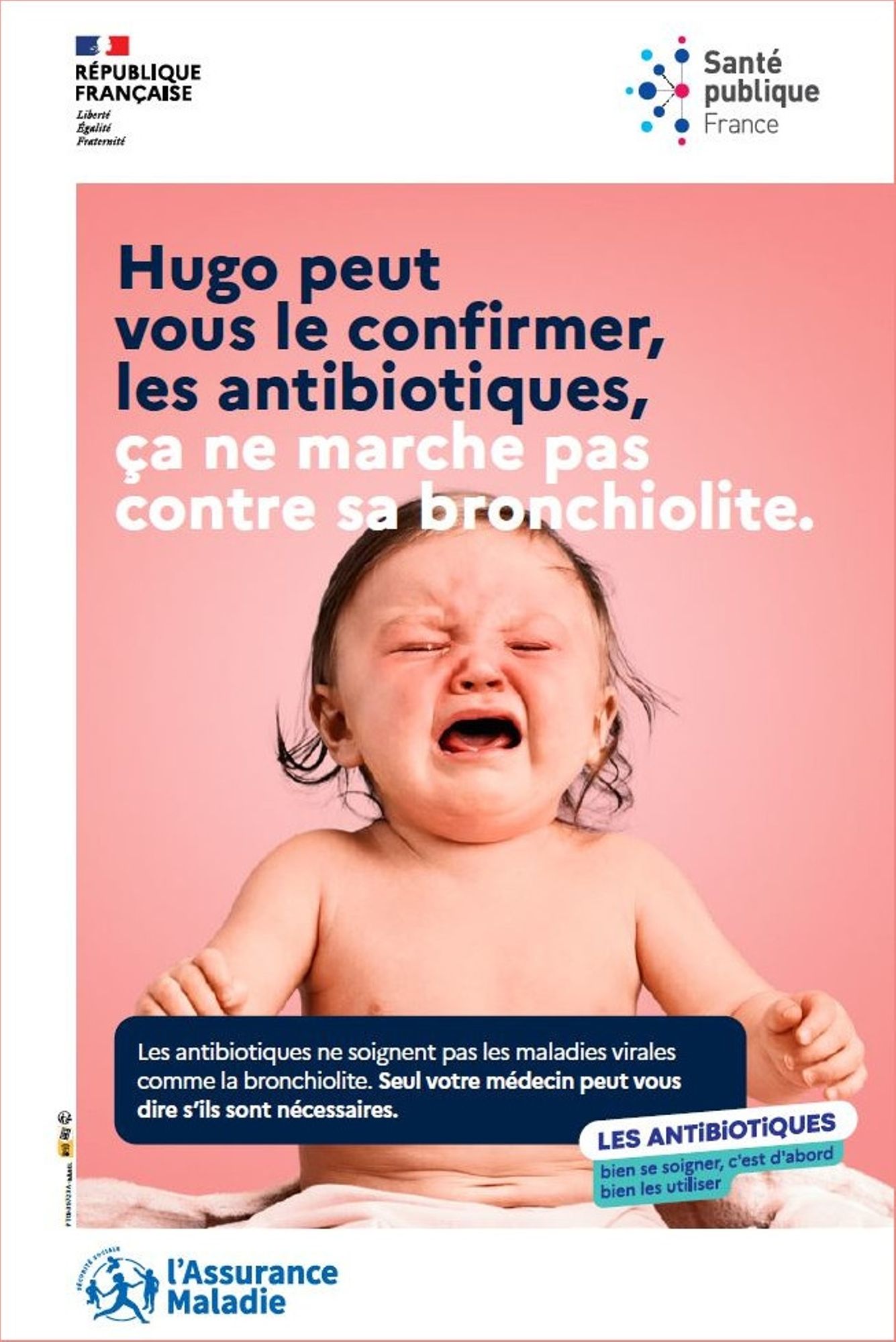 Cette affiche à destination du grand public rappelle que les antibiotiques ne sont pas efficaces contre les maladies virales telles que la bronchiolite.