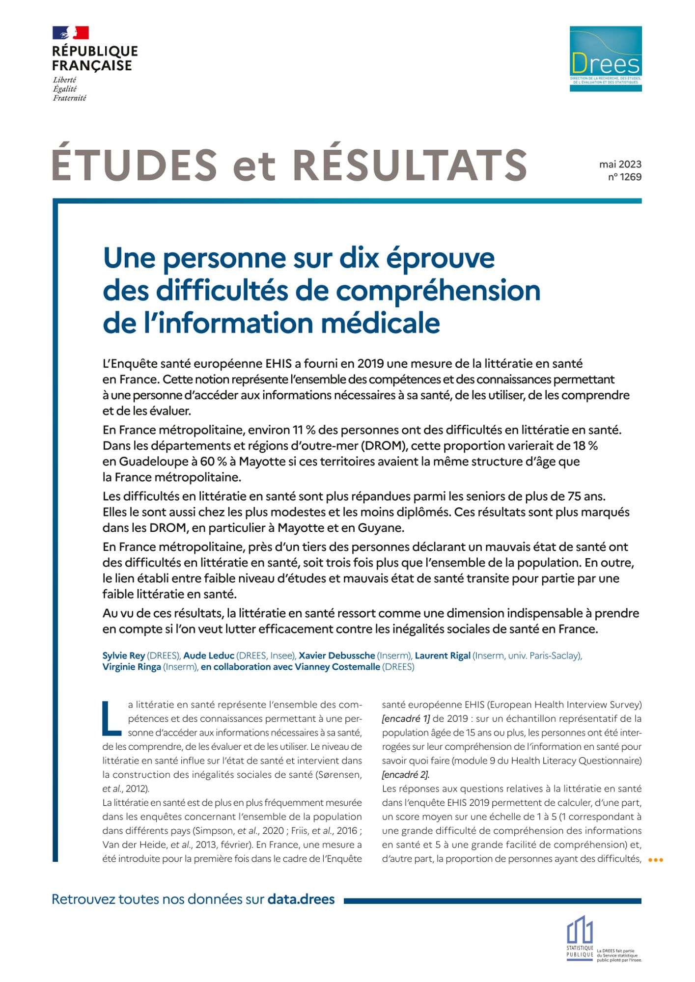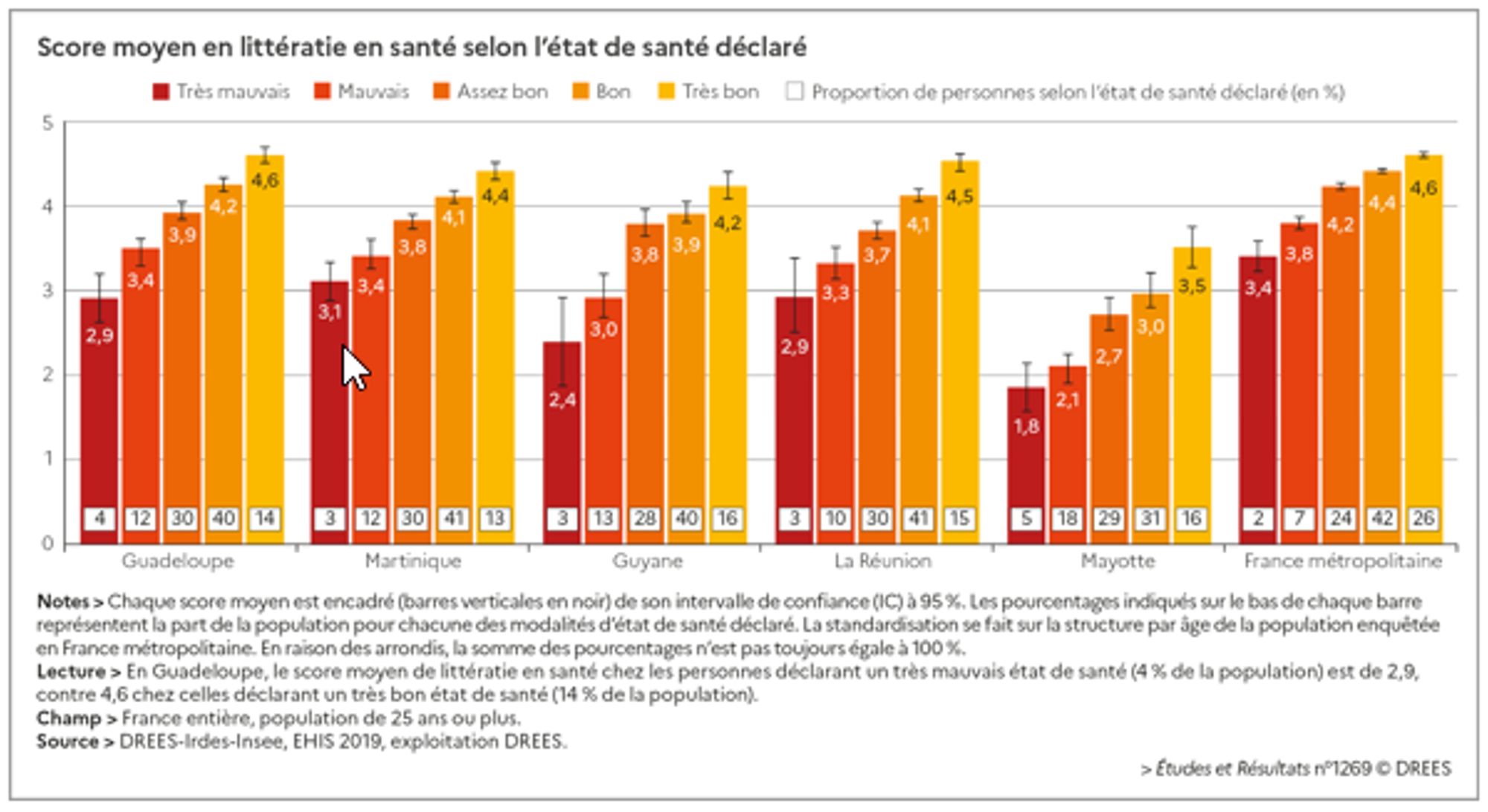 L’Enquête santé européenne EHIS a fourni en 2019 une mesure de la littératie en santé en France. Cette notion représente l’ensemble des compétences et des connaissances permettant àunepersonne d’accéder aux informations nécessaires à sa santé, de les utiliser, de les comprendre etde les évaluer. En France métropolitaine, environ 11 % des personnes ont des difficultés en littératie en santé. Dans les départements et régions d’outre-mer (DROM), cette proportion varierait de 18 % en Guadeloupe à 60 % à Mayotte si ces territoires avaient la même structure d’âge que la France métropolitaine. Les difficultés en littératie en santé sont plus répandues parmi les seniors de plus de 75 ans. Elles le sont aussi chez les plus modestes et les moins diplômés. Ces résultats sont plus marqués dans les DROM, en particulier à Mayotte et en Guyane. En France métropolitaine, près d’un tiers des personnes déclarant un mauvais état de santé ont des difficultés en littératie en santé, soit trois fois plus que l’ensemble de la population. En outre, le lien établi entre faible niveau d’études et mauvais état de santé transite pour partie par une faible littératie en santé. Au vu de ces résultats, la littératie en santé ressort comme une dimension indispensable à prendre en compte si l’on veut lutter efficacement contre les inégalités sociales de santé en France.