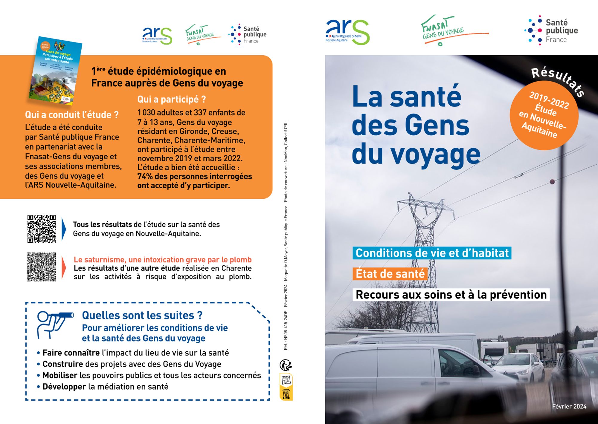 Ce document présente les résultats marquant de la première étude épidémiologique en France auprès de Gens du voyage. Elle a été conduite par Santé publique France en partenariat avec la Fnasat-Gens du voyage et ses associations membres, des Gens du voyage et l'ARS Nouvelle-Aquitaine. Au total, 1 030 adultes et 337 enfants de 7 à 13 ans, Gens du voyage résidant en Gironde, Creuse, Charente, Charente-Maritime, ont participé à l'étude entre novembre 2019 et mars 2022. L'étude a bien été accueillie : 74% des personnes interrogées ont accepté d'y participer. (Résumé éditeur)