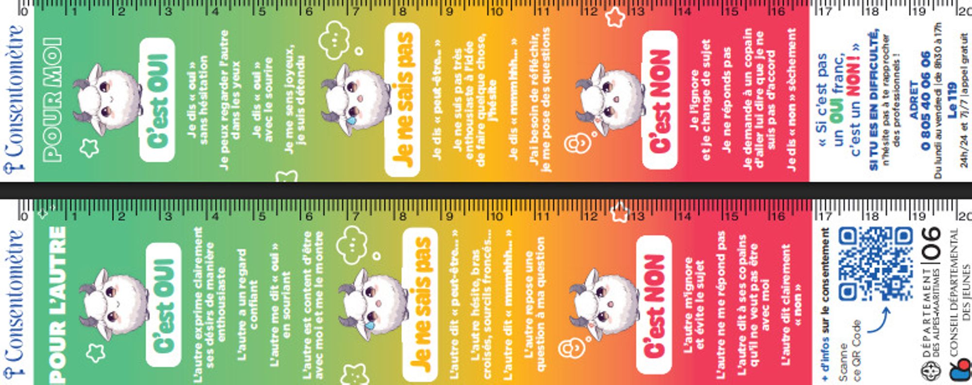 Cet outil a été conçu pour sensibiliser les jeunes à la notion de consentement et prévenir les situations où il n'est pas respecté. Il vise à encourager filles et garçons à reconnaître et refuser toute pression ou comportement irrespectueux dans les relations. Présenté sous forme de règle ou de guide, le consentomètre permet d'identifier facilement ce qui relève du consentement libre et éclairé et ce qui constitue une violation : à travers une gradation colorée, il aide à évaluer si une relation ou une situation est saine, si l'on doit être vigilant ou s'il faut demander de l'aide.