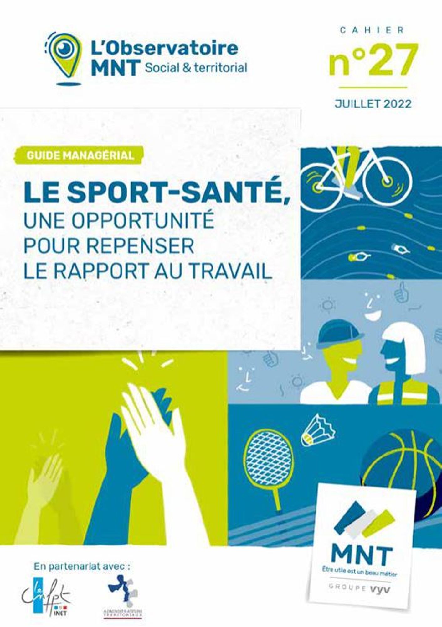Consacré au développement du sport-santé dans le monde territorial, ce guide managérial co-écrit par des élèves administrateurs de l'Institut national des études territoriales (INET) s'appuie sur 43 entretiens menés auprès d’élus locaux, de dirigeants et agents territoriaux, d’experts issus des domaines sportif, médical et mutualiste et de personnalités qualifiées représentant le ministère des sports, le monde de l’entreprise et les syndicats ainsi qu'une exploitation bibliographique. Il relève les bonnes pratiques et formule des recommandations pour les décideurs locaux souhaitant s'engager dans une démarche sport-santé s'inscrivant dans une stratégie RH globale.