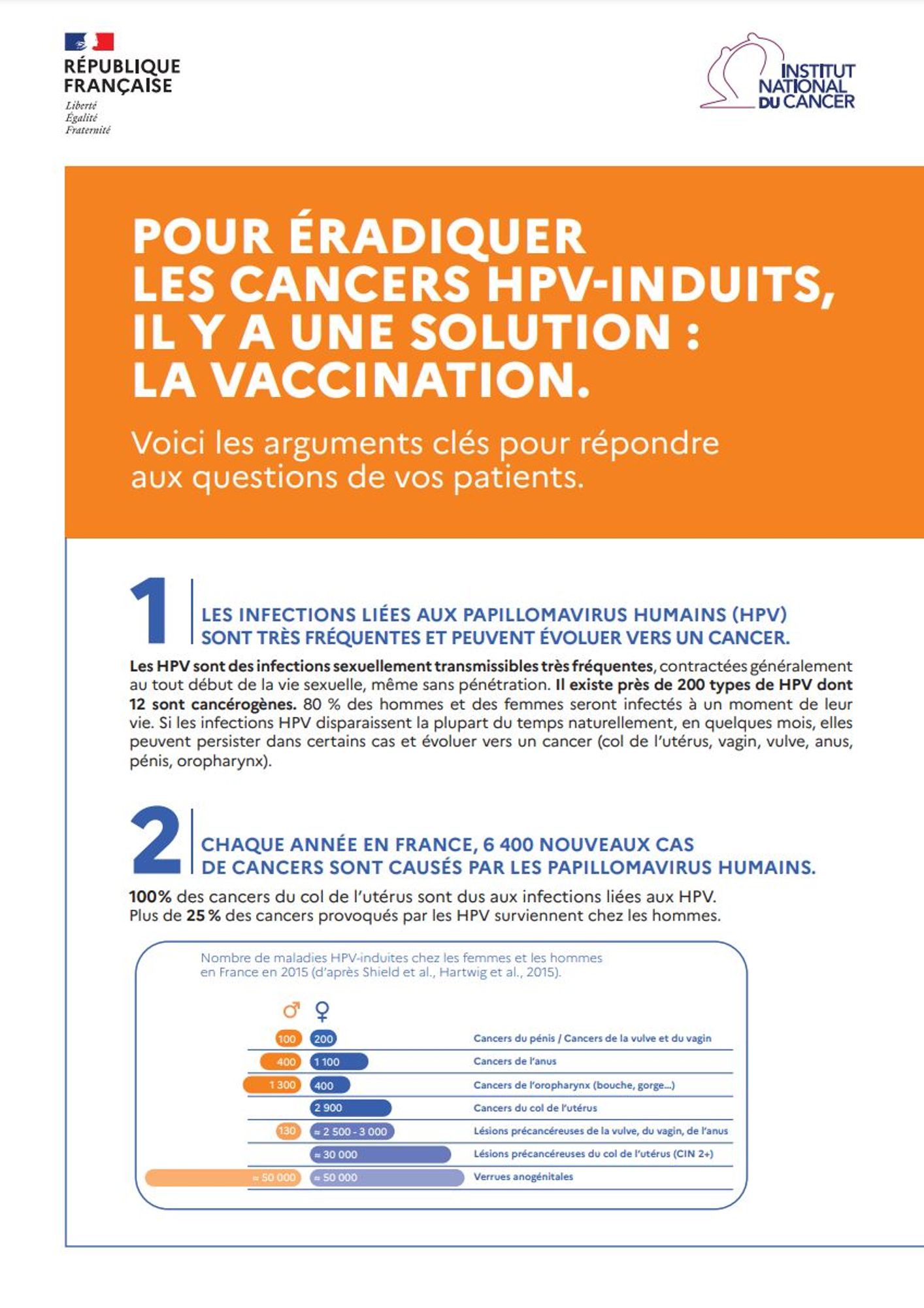 Pour éradiquer les cancers HPV-induits, il y a une solution : la vaccination. L’INCA publie un dépliant à destination des professionnels de santé avec les arguments clés pour répondre aux questions de leurs patients.