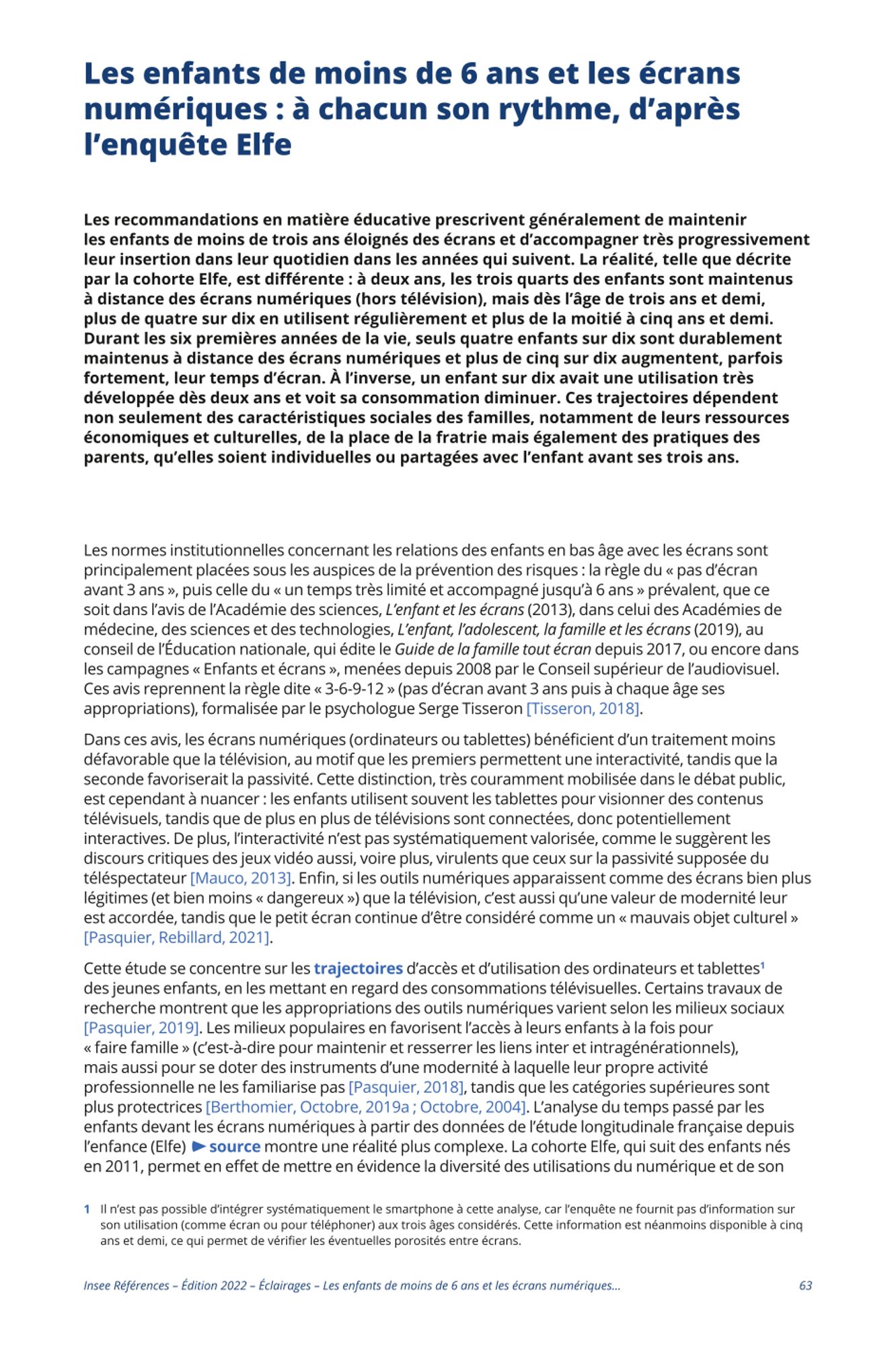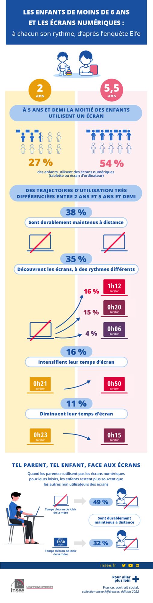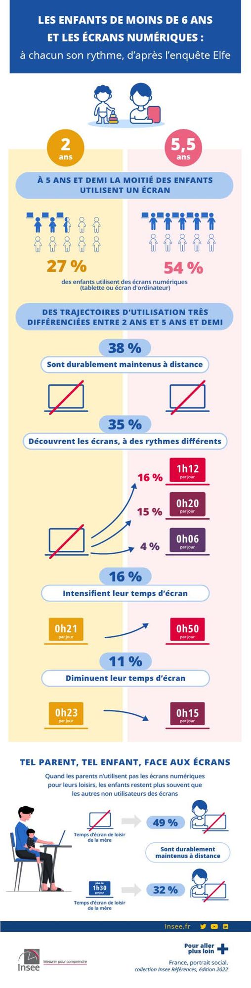Les recommandations en matière éducative prescrivent généralement de maintenir les enfants de moins de trois ans éloignés des écrans et d’accompagner très progressivement leur insertion dans leur quotidien dans les années qui suivent. La réalité, telle que décrite par la cohorte Elfe, est différente : à deux ans, les trois quarts des enfants sont maintenus à distance des écrans numériques (hors télévision), mais dès l’âge de trois ans et demi, plus de quatre sur dix en utilisent régulièrement et plus de la moitié à cinq ans et demi. Durant les six premières années de la vie, seuls quatre enfants sur dix sont durablement maintenus à distance des écrans numériques et plus de cinq sur dix augmentent, parfois fortement, leur temps d’écran. À l’inverse, un enfant sur dix avait une utilisation très développée dès deux ans et voit sa consommation diminuer. Ces trajectoires dépendent non seulement des caractéristiques sociales des familles, notamment de leurs ressources économiques et culturelles, de la place de la fratrie mais également des pratiques des parents, qu’elles soient individuelles ou partagées avec l’enfant avant ses trois ans.