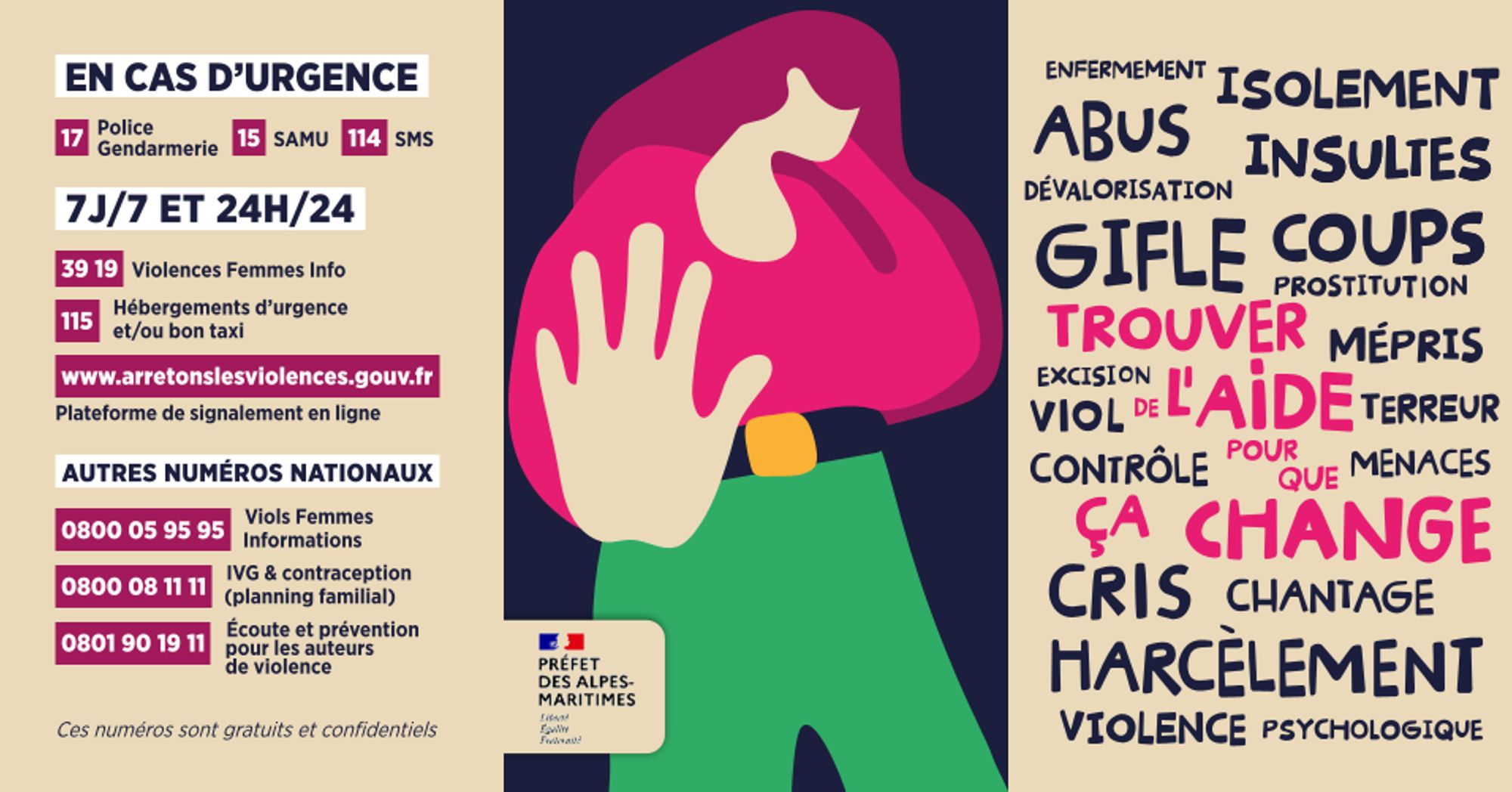 Flyer 2023 pour lutter contre les violences faites aux femmes. Ce flyer indique les numéros d'urgences, site web et structures dans les Alpes-Maritimes.
